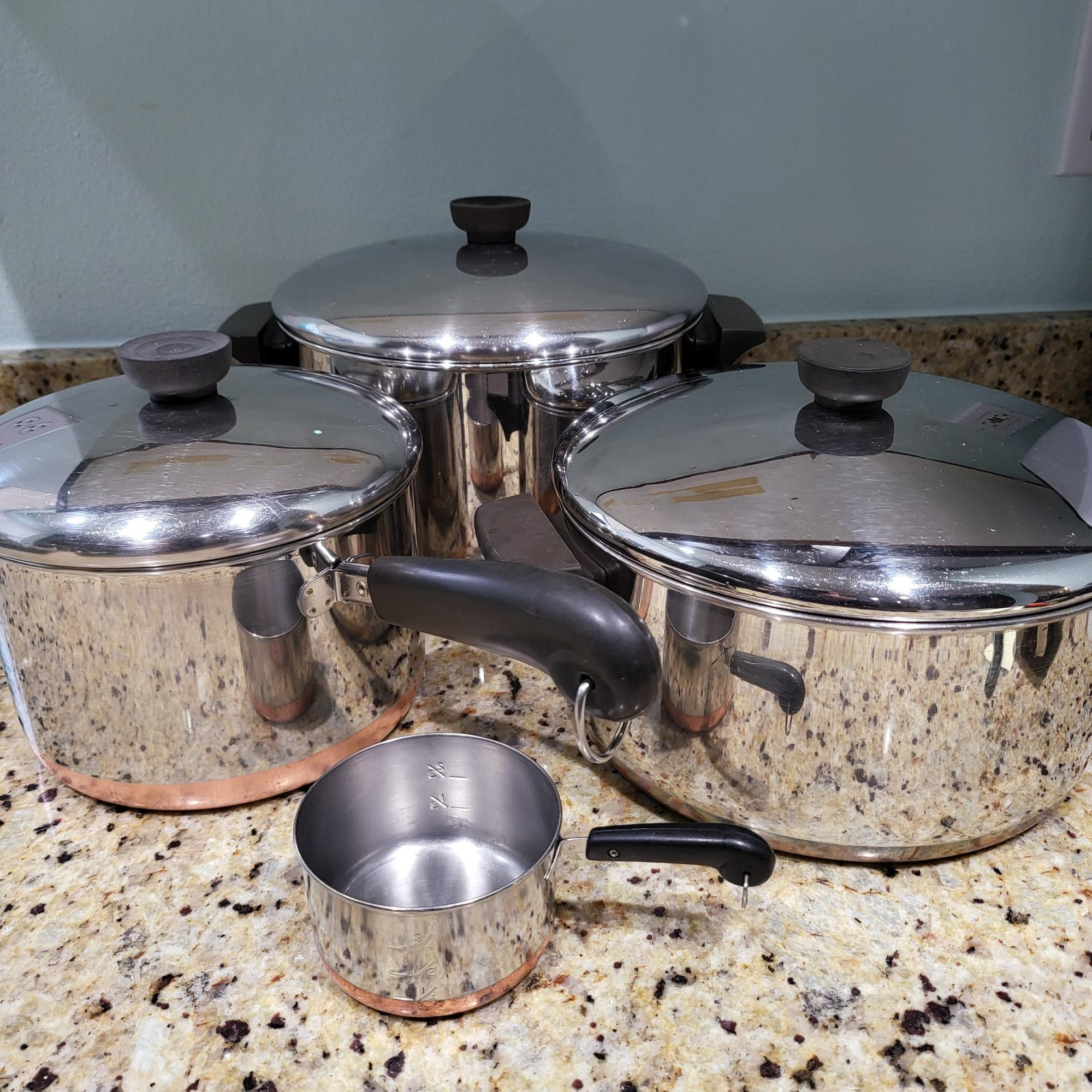 Revere Ware USA: (1) lidded 6qt stock pot, (1) lidded 4.5qt soup pot, (1) lidded 3qt sauce pan with handle, and a 1-cup handled measuring cup.