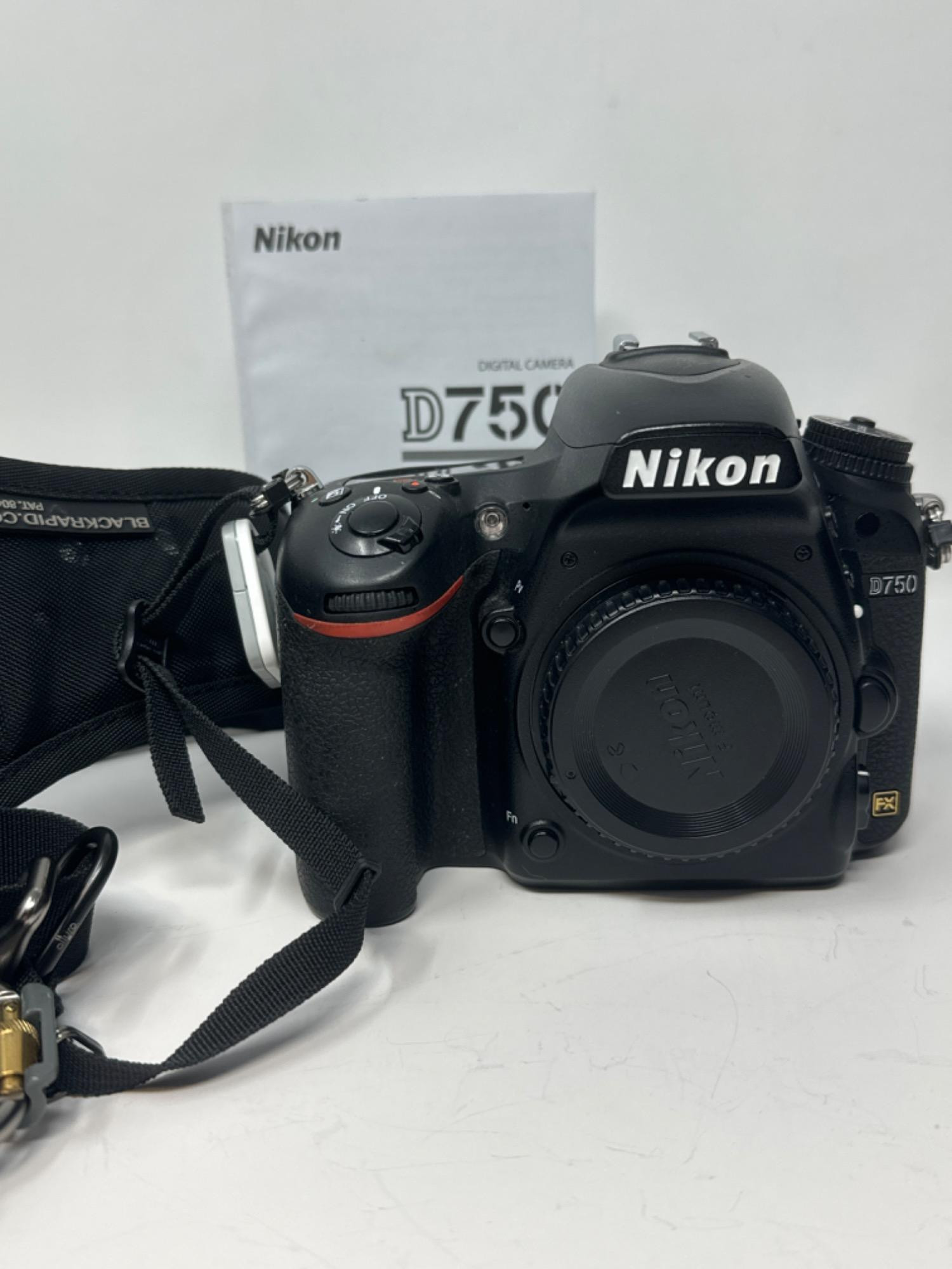 The Nikon D750 is a digital SLR device with a digital 24.3 MP sensor that allows you to capture clear images. The 3.2-inch display on this Nikon camera provides you with a convenient view of the image files. This camera comes in black and weighs 26.4 oz. Camera body only, battery and battery charger, and instruction manual. Camera powers on with rechargeable battery. Successfully shoots a picture. Shutter count is noted in pictures. All other functions unknown.