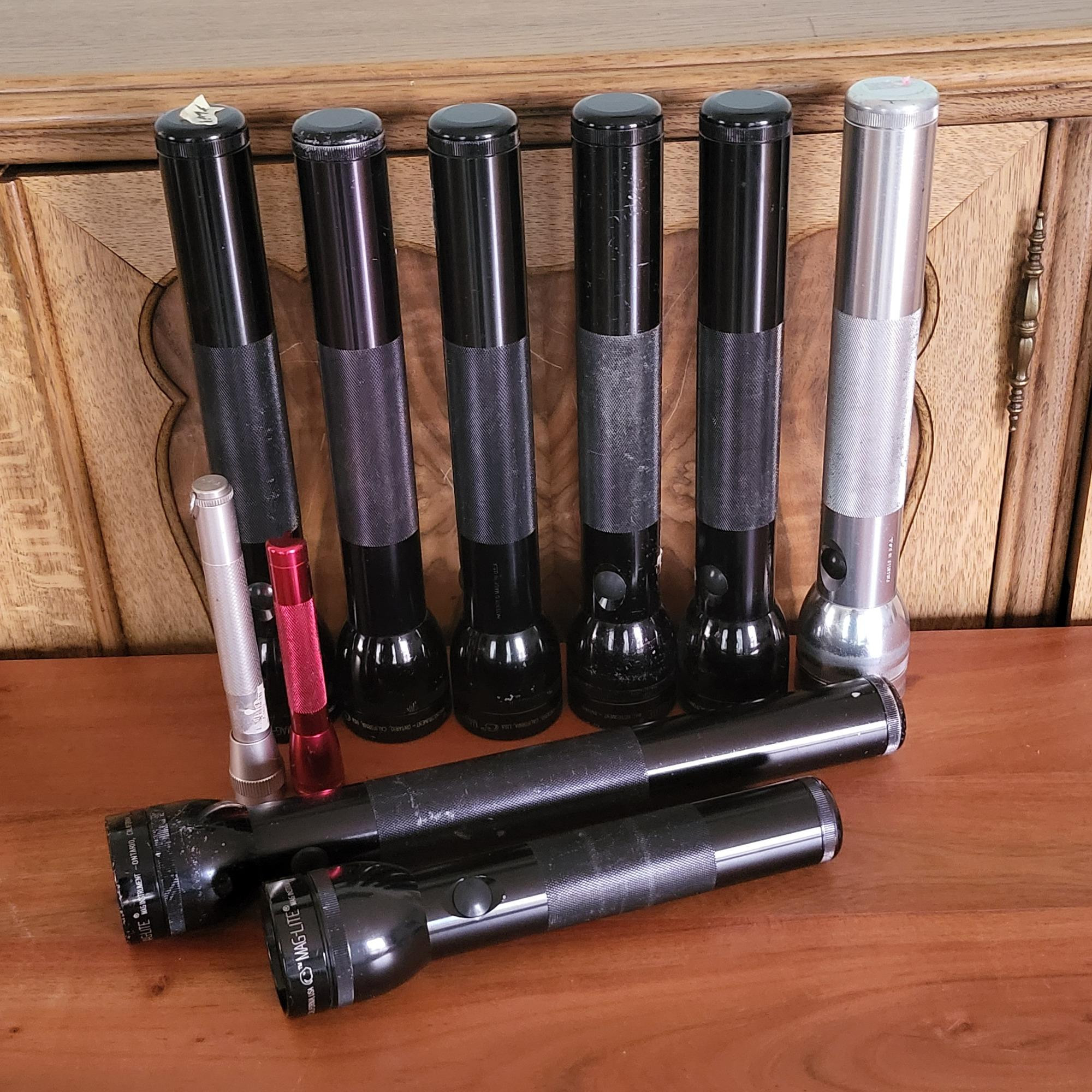 Storage tub filled with many Meg-Lite's, one is by Dorcy plus several other flashlights. Some may need new batteries.
