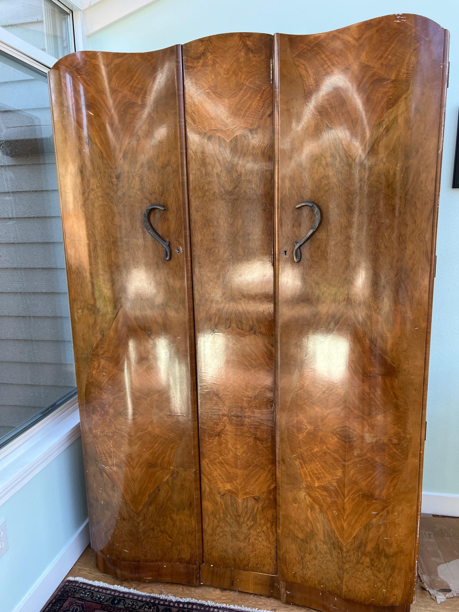 Outstanding old burl walnut clothing armoir by Woodland Furniture. Has key to lock both side doors. Middle door is magnetic. Each shelf has a metal plaque with name of clothing category (hats, pajamas, etc.) Clothing rods in each side closet. Original hardware. Heavy and qualilty cabinetry. Located on ground floor. Bidding on this lot is an agreement that: (1.) You will have at least 2 capable, able-bodied persons to lift and load at a minimum. (2.) You
