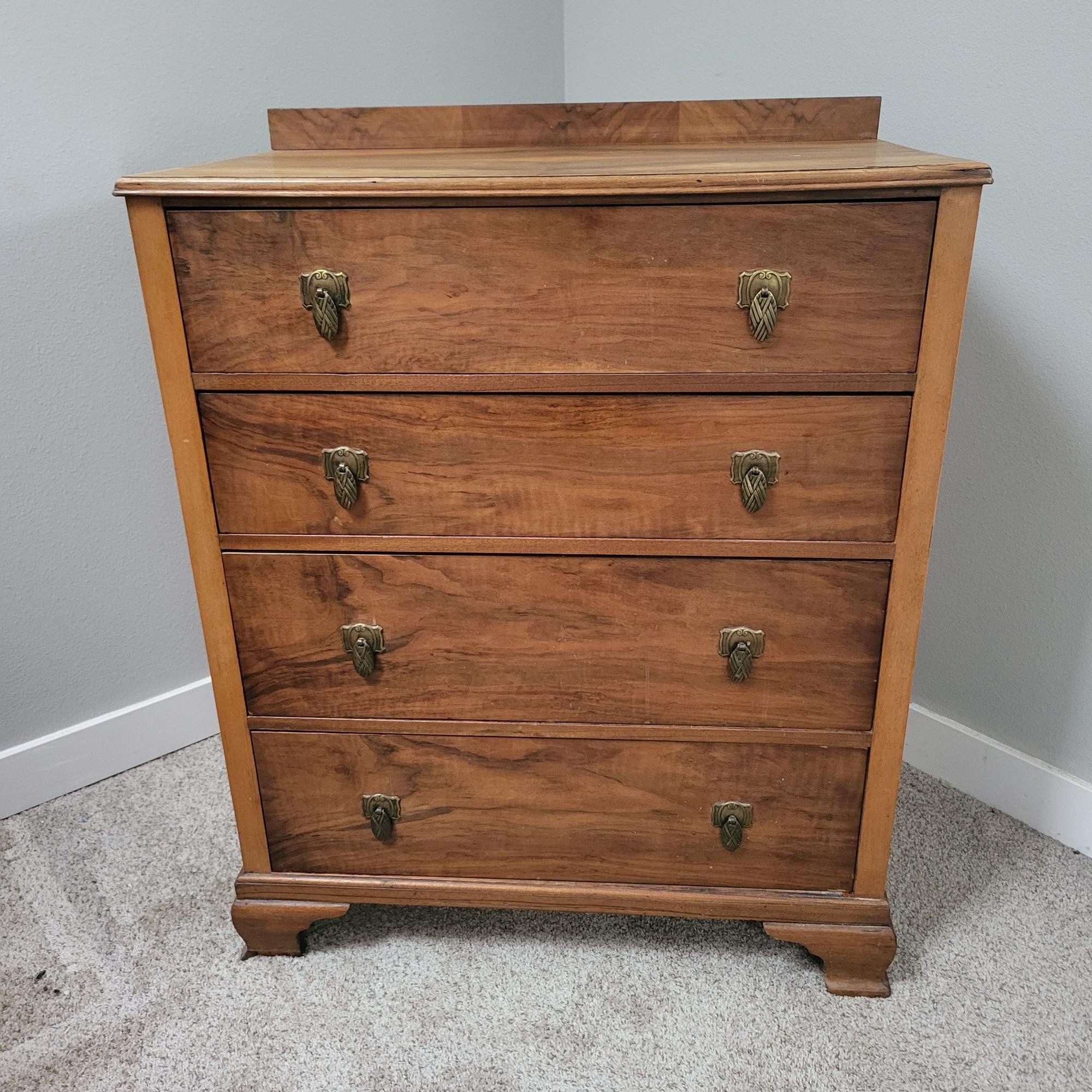 Antique dresser, unique wood grain, four drawers with knocker-style brass pulls and dovetailing.