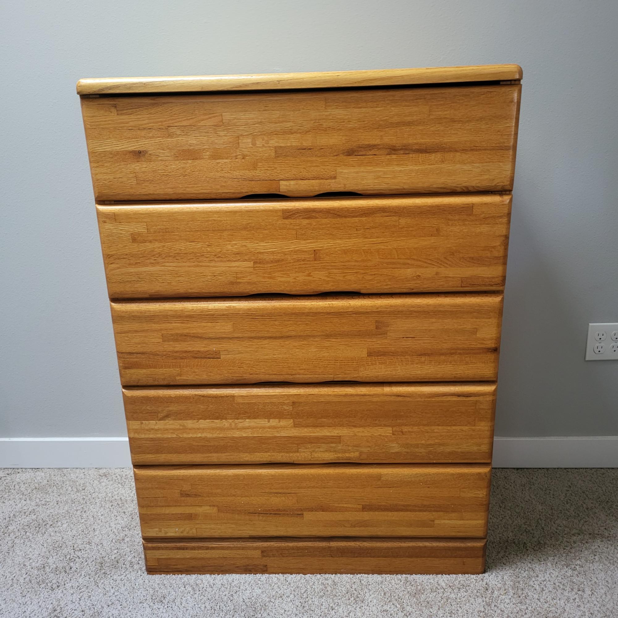 Mid century Russell Wright style, five drawer wood dresser. Dresser located on 2nd floor. Steps involved for removal. Bidding on this lot is an agreement that: (1.) You will have 2 capable, able-bodied persons to lift and load at a minimum. (2.) You