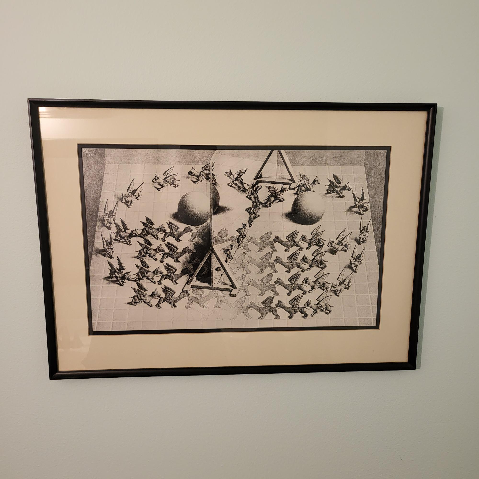 Matted and framed print titled Magic Mirror by M.C. Escher.