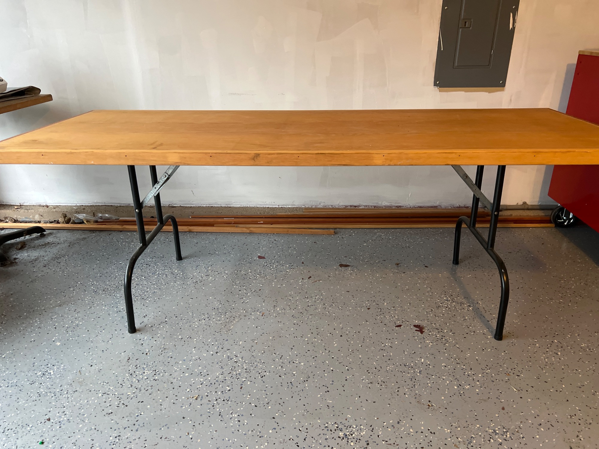 Beautifully crafted wood table top with folding metal legs buffet-style table. Multi-purpose. This table does not fold. Be sure to review dimensions when considering pickup. Bidding on this lot is an agreement that: (1.) You will have 2 capable, able-bodied persons to lift and load at a minimum. (2.) You
