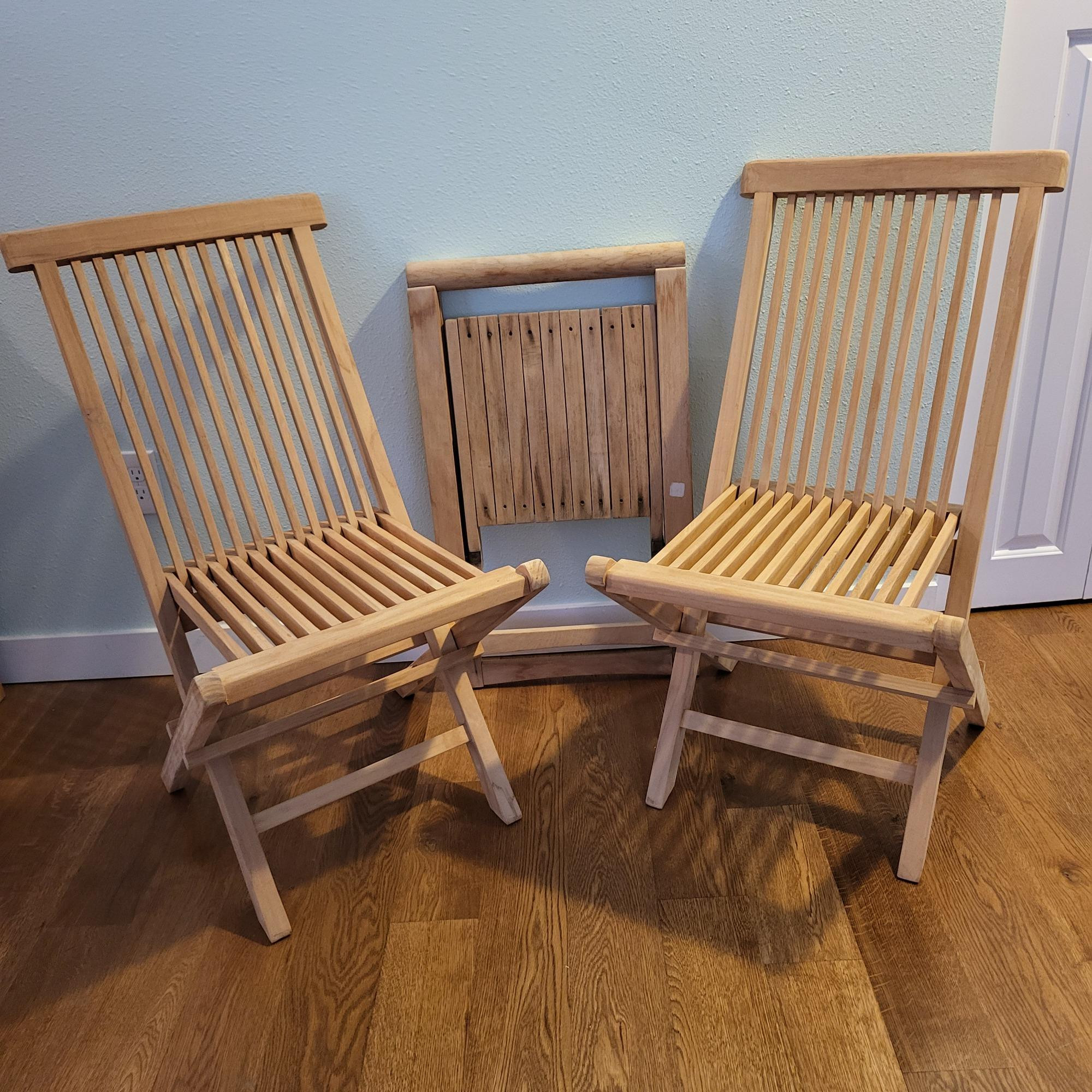 Two teak folding chairs 24" x 35" x 18.5". Smaller chair is 18" x 17" x 28", folds up flat for easy storage.