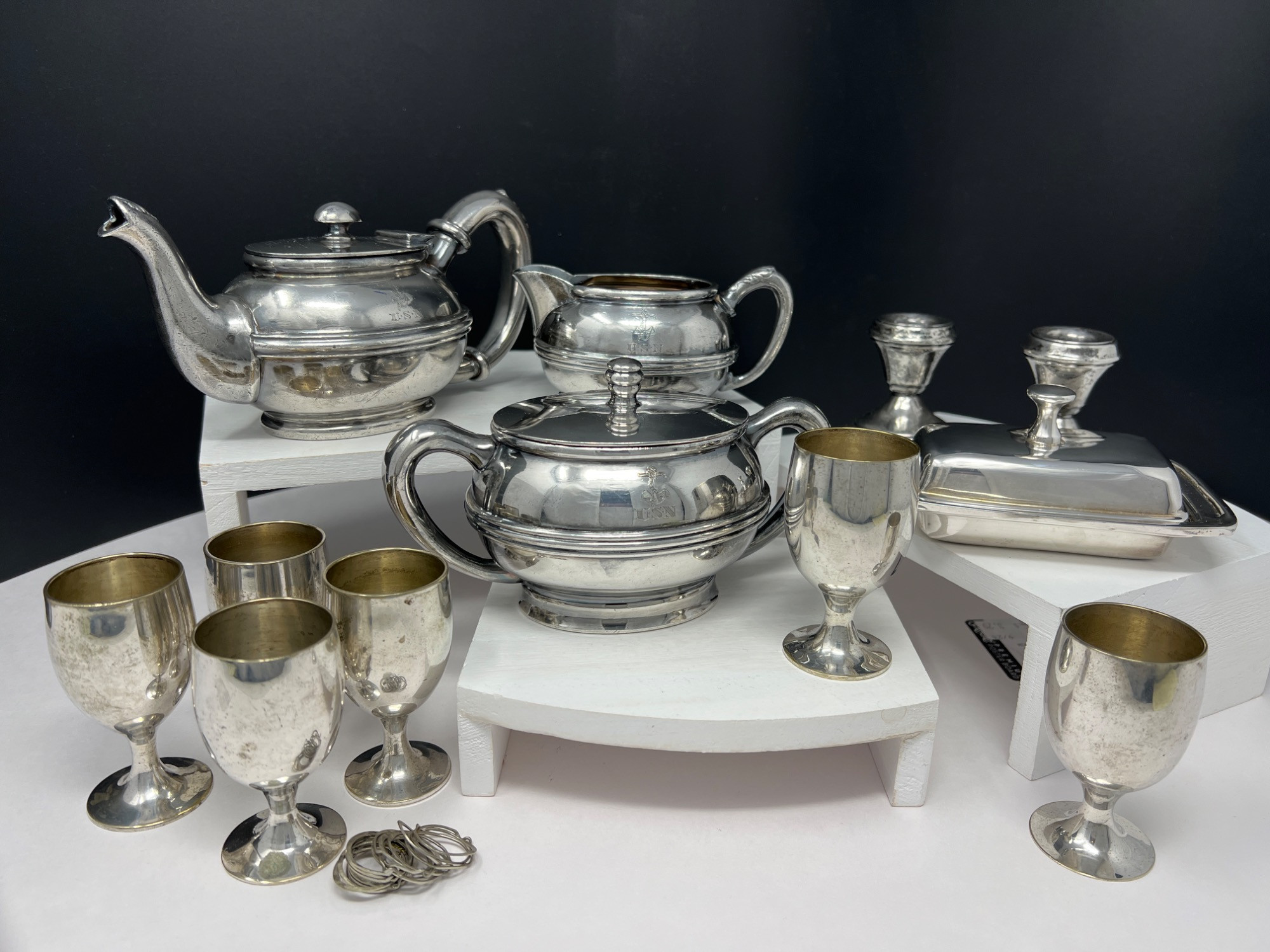 2.25” pair of sterling candlestick holders 5”x 3” Brissi silver petit butter dish (holds one stick of butter) Reed and Barton USN silver soldered Sugar Bowl 4” tall x 7” wide International Silver Company silver soldered creamer (2.5” tall x 4.5” wide) and single service teapot (4”tall x 8” wide) Six (6) 3” tall EPNS Leonard cordials
