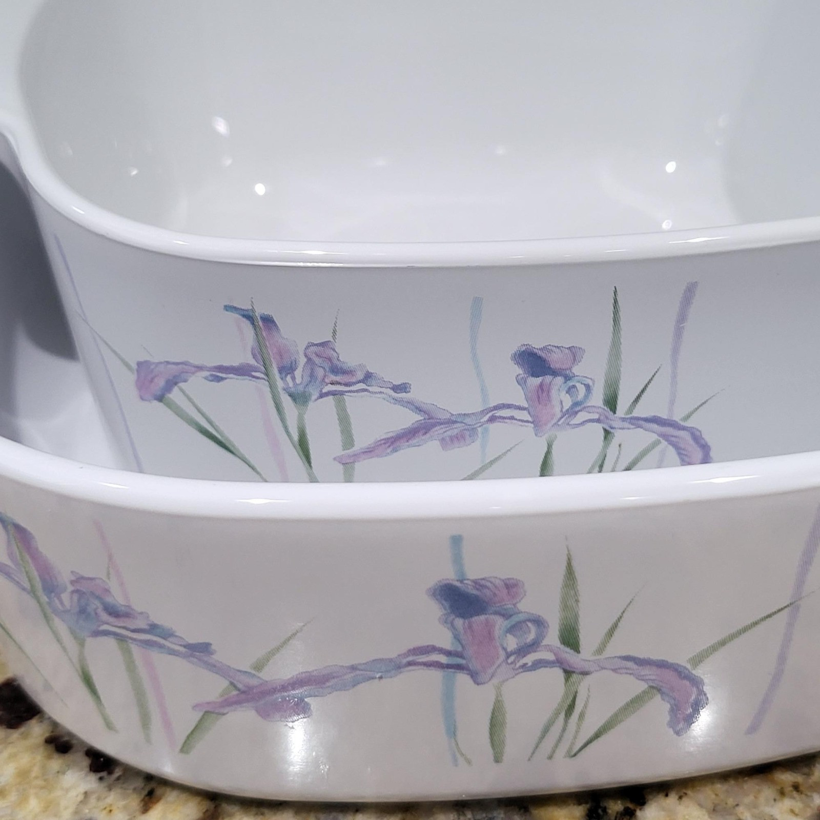 Purple Iris flower pattern: 7" and 8" lidded ceramic baking pans and a 12" x 10" casserole pan.