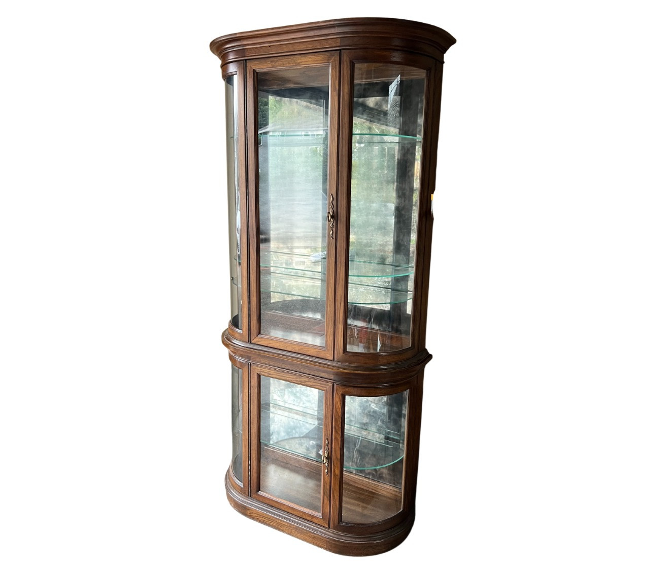Glass shelves, lighted, bow front glass on each side with flat fronted glass. Cabinet is in two sections and connected with screwed metal fasteners in back. Inside back is mirrored with a smoky grey/silver swirl antique effect. Common scratches or dings at base commensurate with mid century age and use. This cabinet is located in Bellevue off of SE 8th Street. Bidding on this lot is an agreement that: (1.) You will have 2 capable, able-bodied persons to lift and load at a minimum. (2.) You