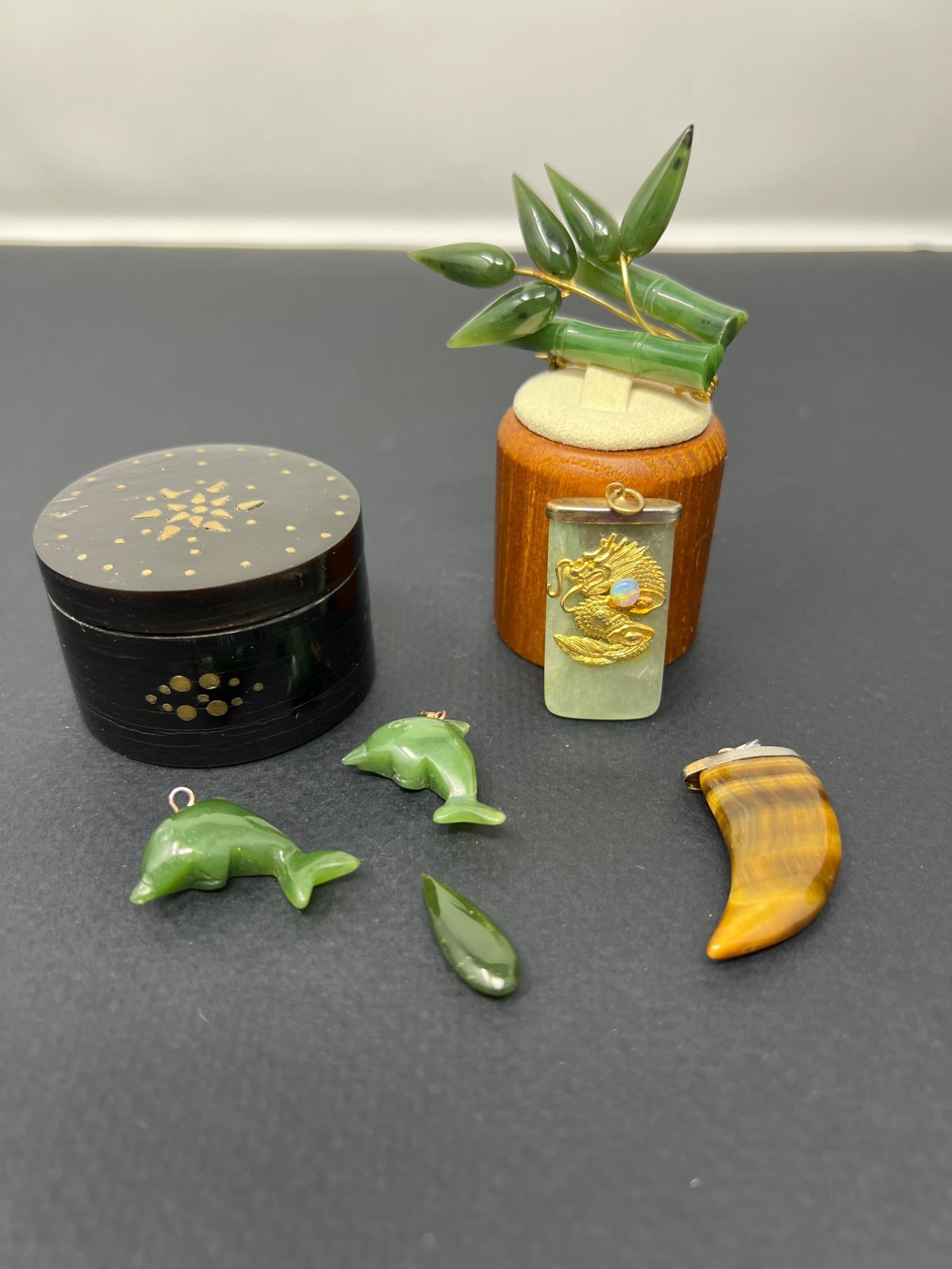 Genuine jade bamboo pin and two dolphin jade charms and a single tear drop shaped piece of jade, tigers eye tooth, Victorian Chatelaine pill box measuring 2.25” round, and natural jade pendant with possibly 18k dragon overlay, and small trinket box.