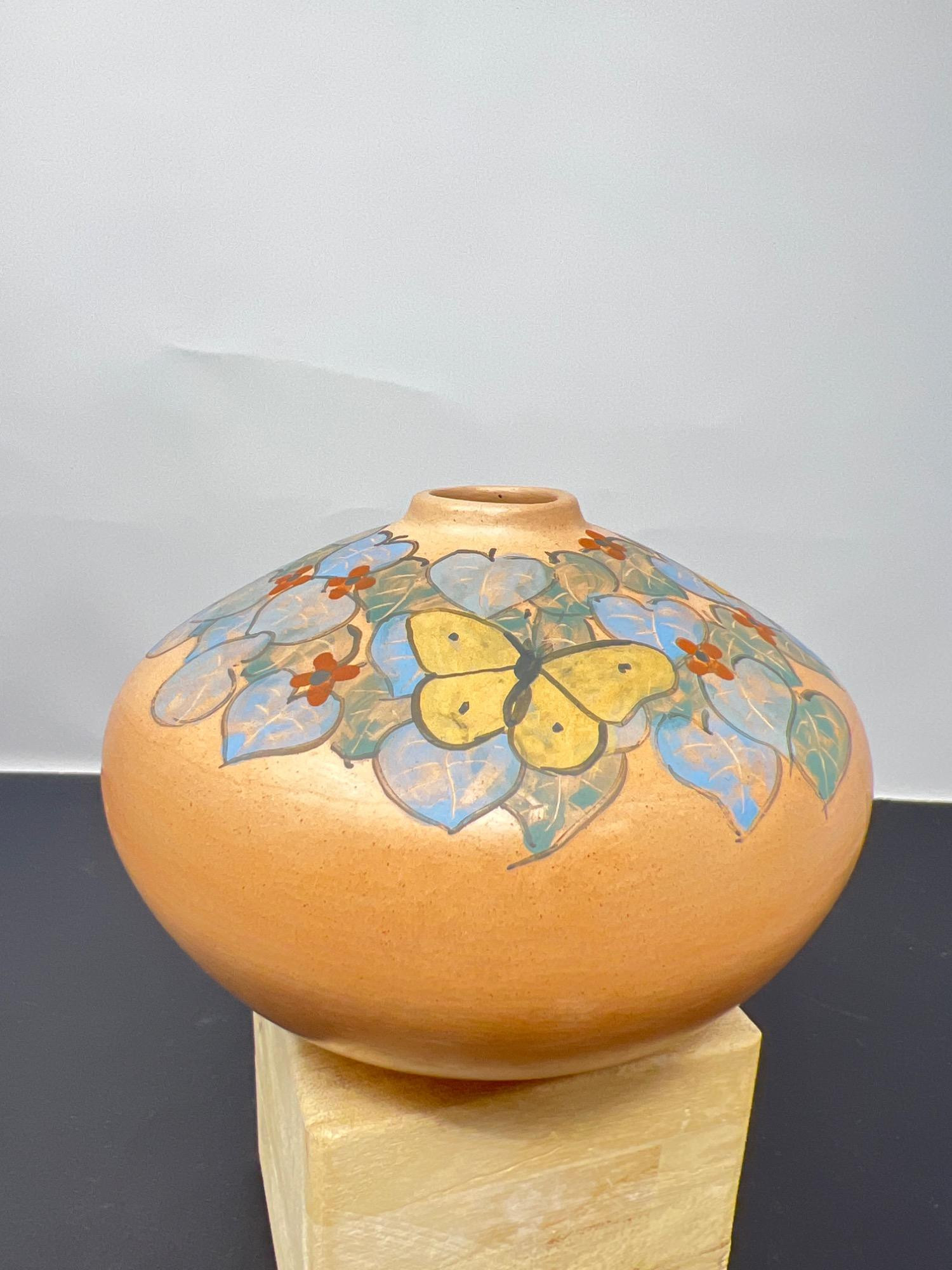 Vintage Santa Cruz, Bolivia, Tiburcio hand painted with blue leaves in the shape of hearts and yellow butterflies onto exquisitely made clay vase. GT