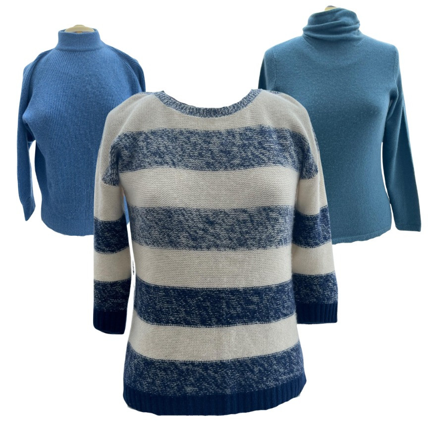 Three vintage 100% cashmere sweaters. Blue and creamy white striped, quarter sleeve, Size medium; vintage gathered turtle neck muted blue, long sleeve, size medium; and a true blue long sleeve with high neck sweater, size medium (small hole near bottom of sweater (can be mended).