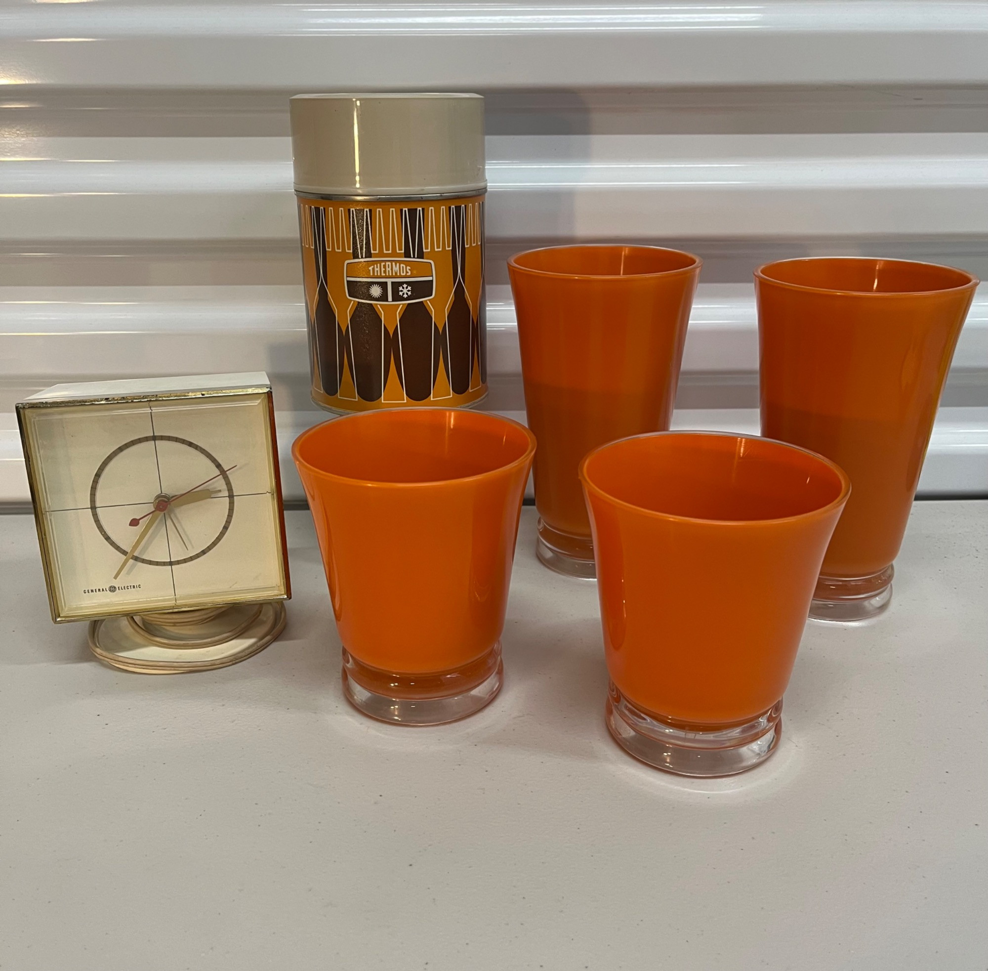 Vtg. Plastic Drinkware, Thermos, G. E. Tulip Base Alarm Clock