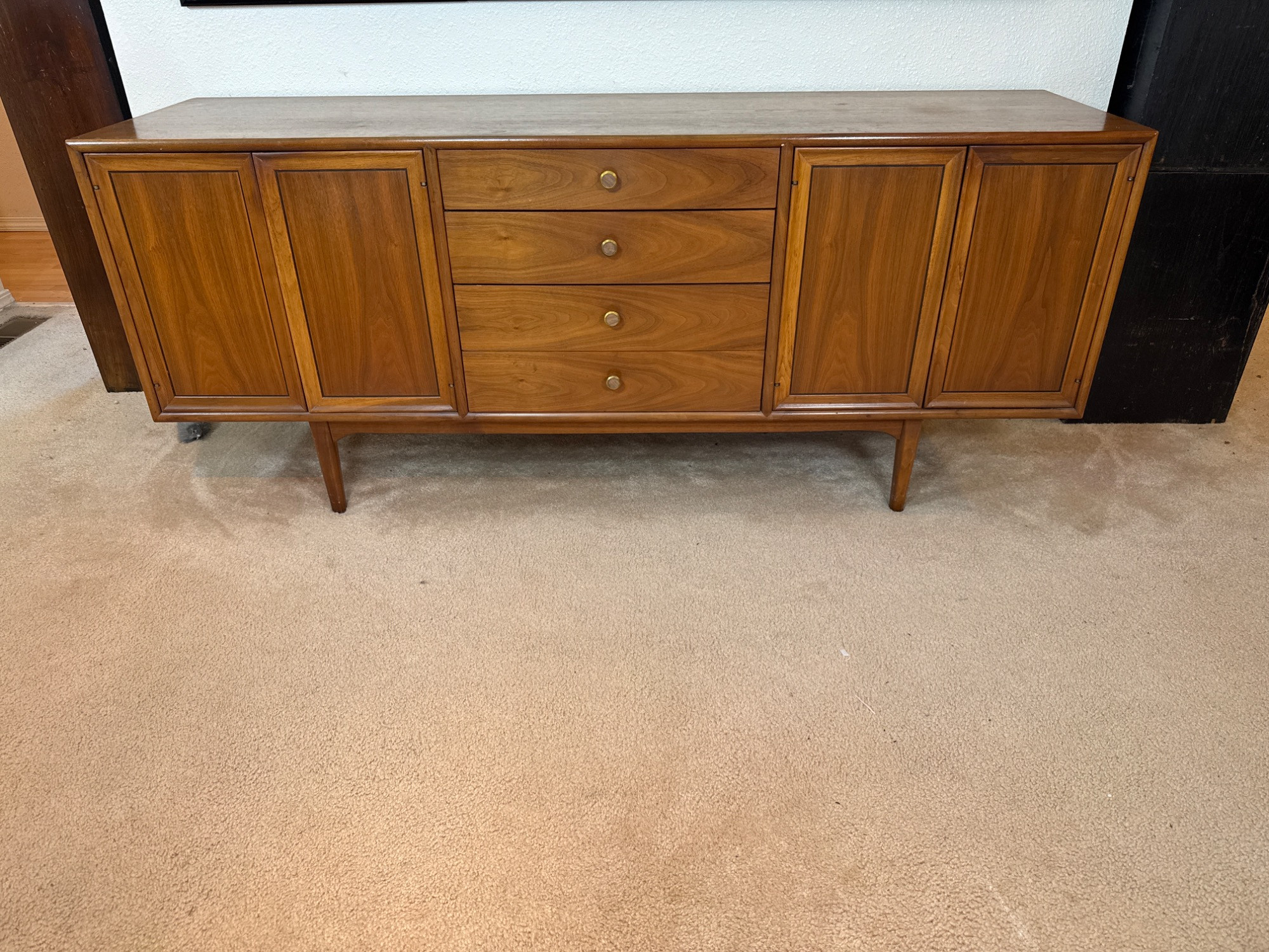 MCM danish sideboard. Drexel declaration. Solid Wood. Comps suggest it is walnut. Four drawers with brass knobs. Spring action doors. Each side cabinet includes lighting. One needs a new bulb. Top drawer is lined with felt. Dovetail construction HEAVY, bring help to load. No stairwells to traverse.
