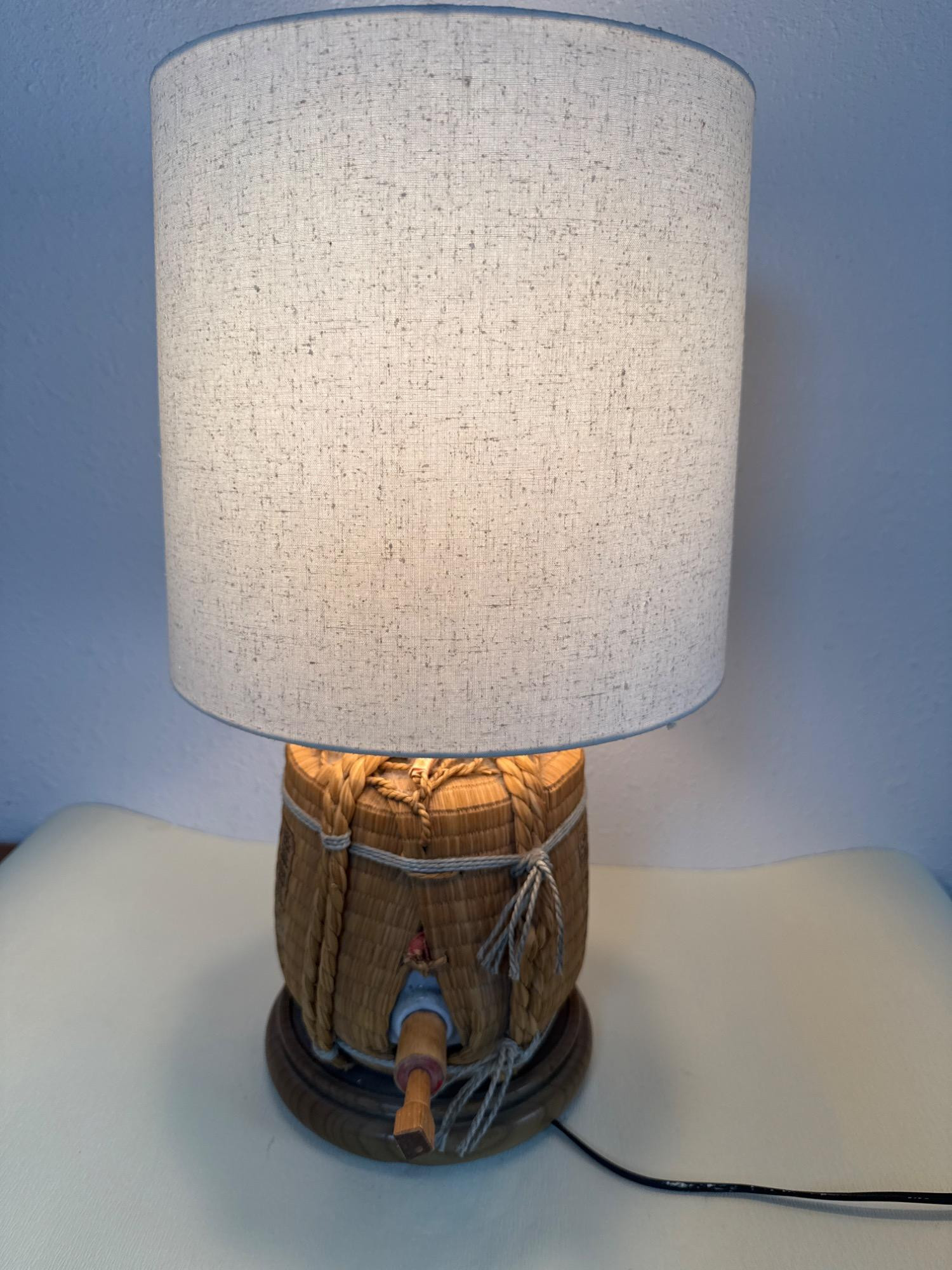 Vintage sake bottle with Spicket and woven cover with braided rope. Wood base. Lamp shade is in good condition. Ceramic jar.