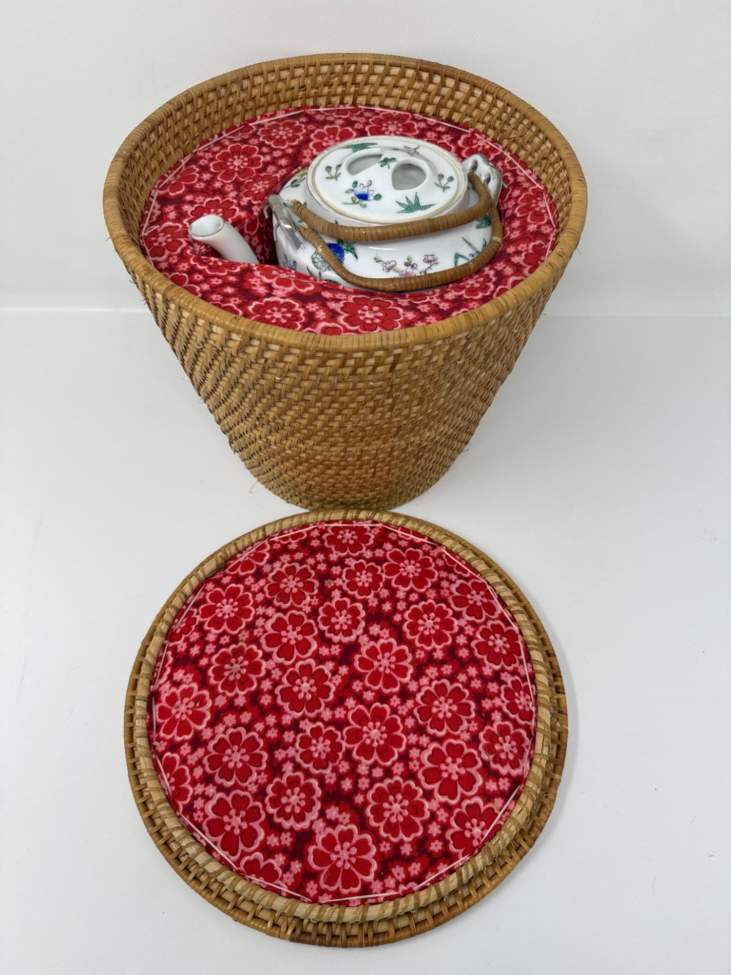 Stanley floral porcelain teapot. Hand painted in Hong Kong. Woven handle. Basket with padded surround.