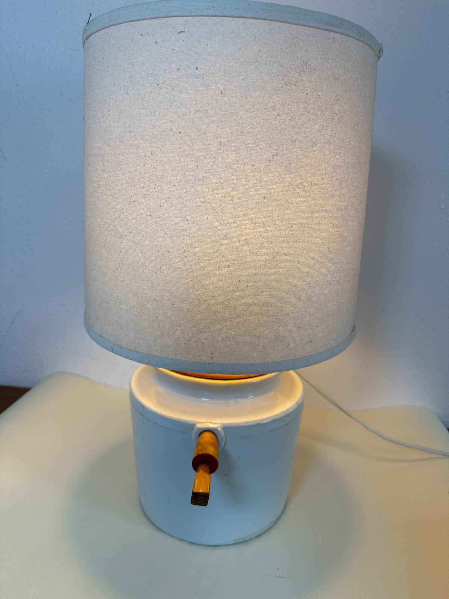 Stoneware crock with Spicket and wood lid. Converted to lamp. Shade is in good condition. Dimensions include shade. All white.