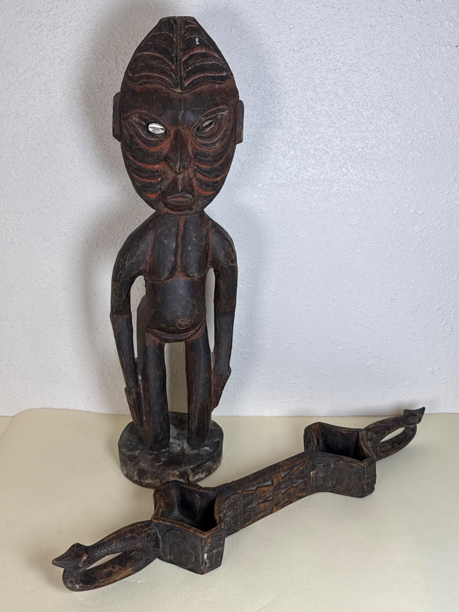 African Luba maternity figure. Aboriginal wedding cup. Both are hand carved in wood. Maternity figure has shell eyes. Wedding cup is 22.5 inches long, 5 inches wide.