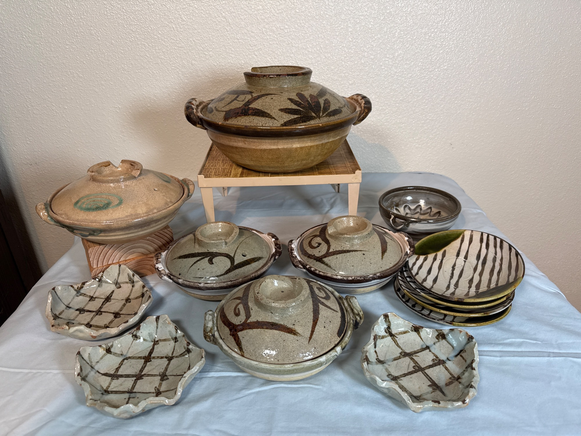 Large Donabe clay pot with lid. Three smaller matching Donabe pots. Medium sized Donabe pot with clamshell design. Three matching clay trays. Four matching plates. Clay bowl with spout. All are glazed.