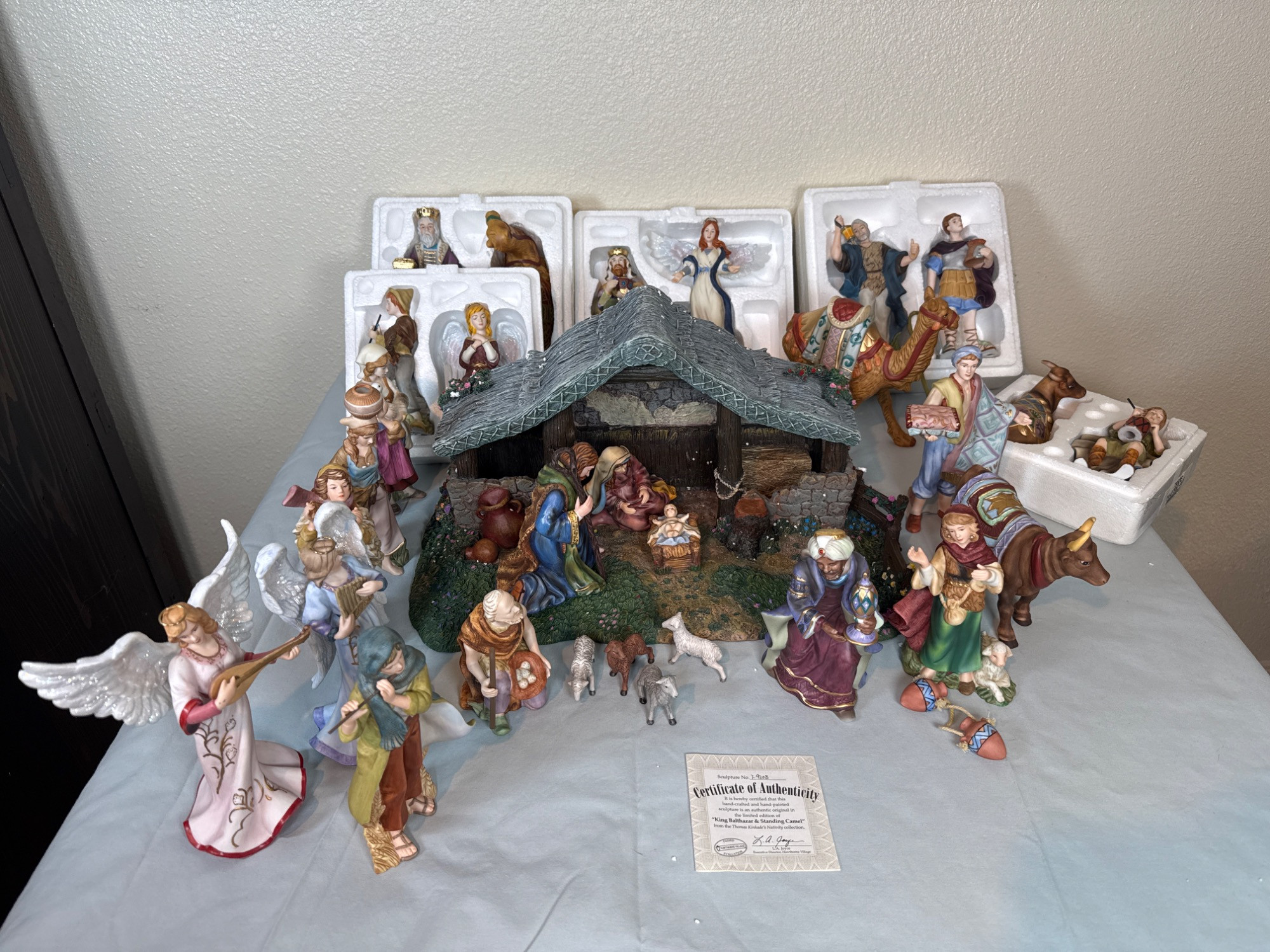 Large Thomas Kincaid nativity collection. Each box has a certificate of authenticity. Two small animals have broken legs. Porcelain figures and crafted beautifully. Resin stable with color and detail. Kept in original boxes.