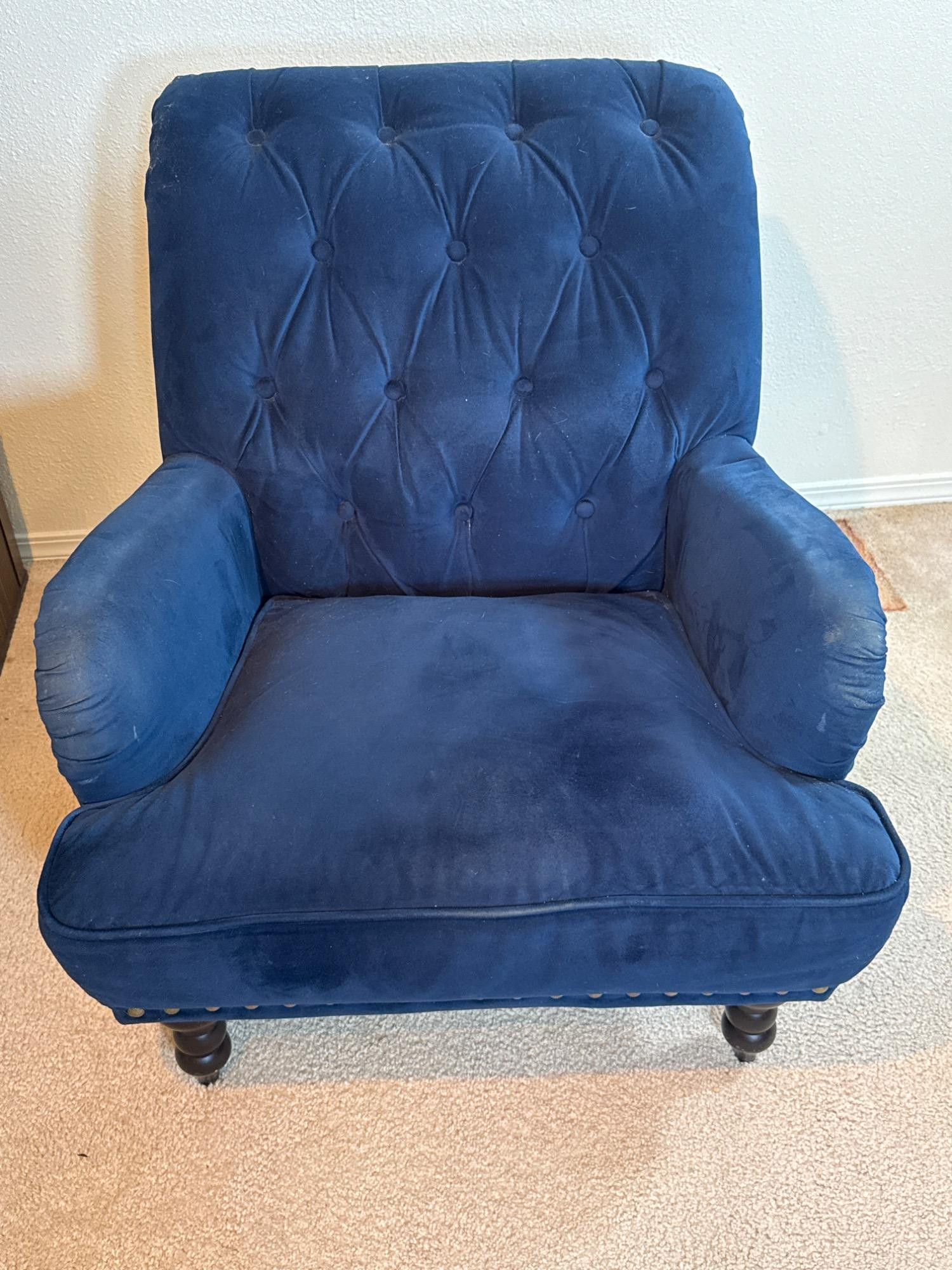 Blue velvet side chair with turned legs and brass tacks. A bit dusty and needs vacuumed. In good condition. Arm rest could be gently cleaned with soap and water to refresh. Solid chair with firm seat. Bold and vibrant color.