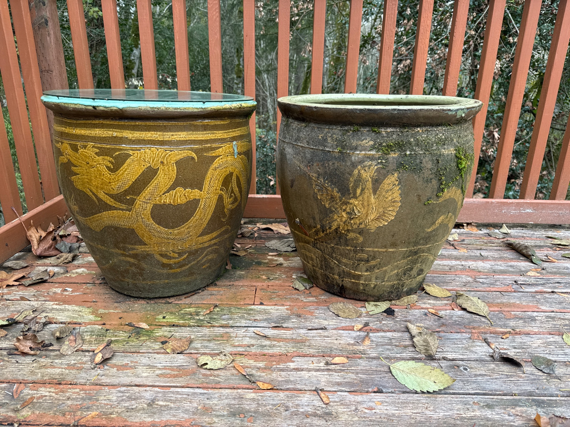 Heavy, large stoneware egg pots. Brown with gold colored detail. Dragon and floral theme. Glazed interior painted green and other is teal. One has glass top. Used to store duck eggs during fermentation