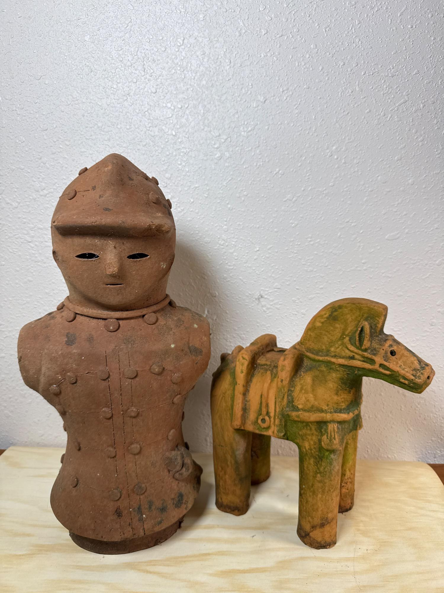 Terra-cotta Chinese warrior and horse statues. Have been outside. Small chip on Warriors helmet. In good condition for being exposed to elements. Horse dimensions are 11 inches long, 11 inches tall. 4 inches wide.