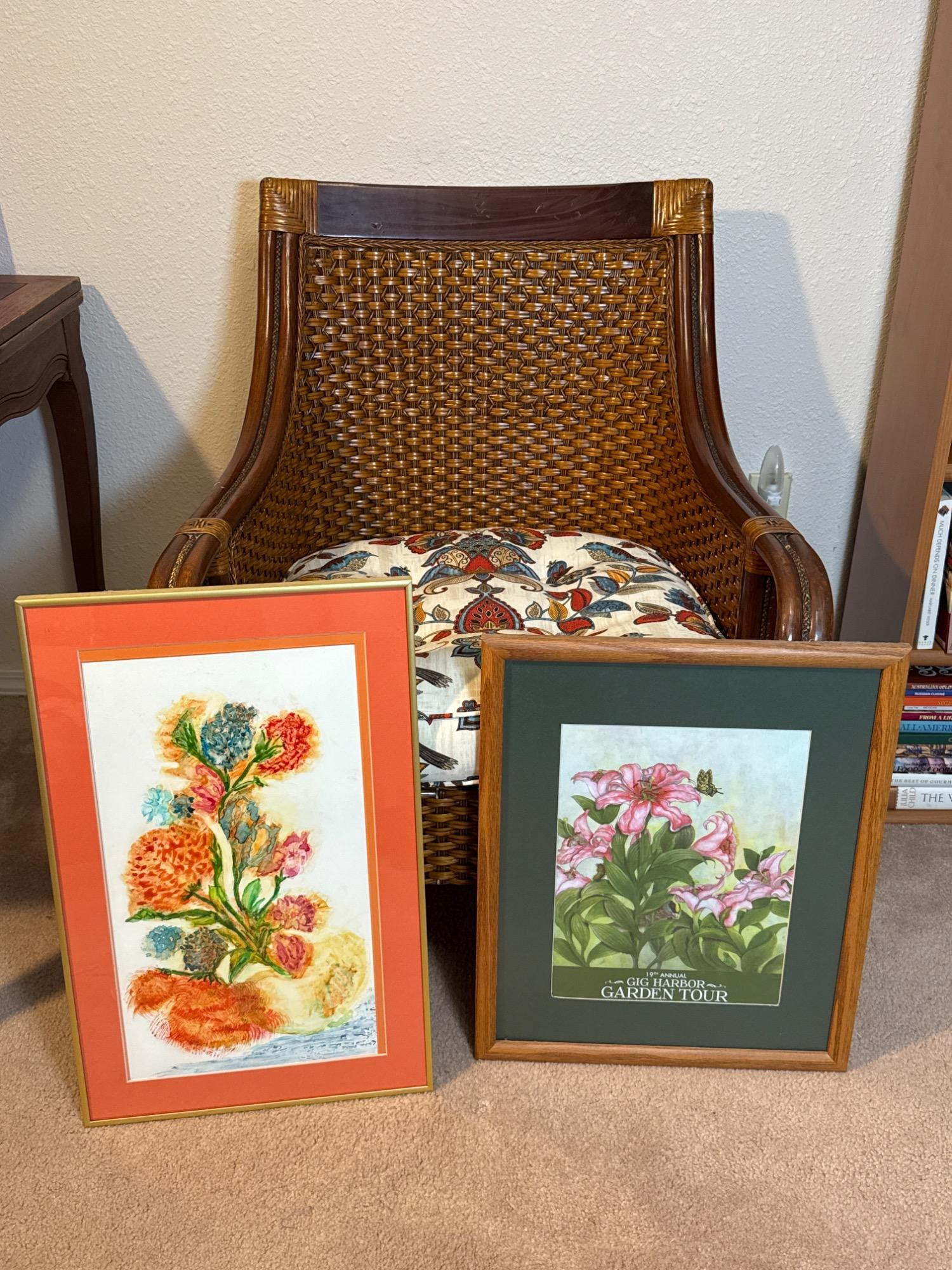 Bamboo and rattan side chair. Bold patterned cushion. Two framed floral prints one is from the Gig Harbor Garden tour. Dimensions for orange framed floral print is 16 inches wide, 24.5 inches tall. Gig Harbor Garden tour print 17.5 inches wide, 22 inches tall.