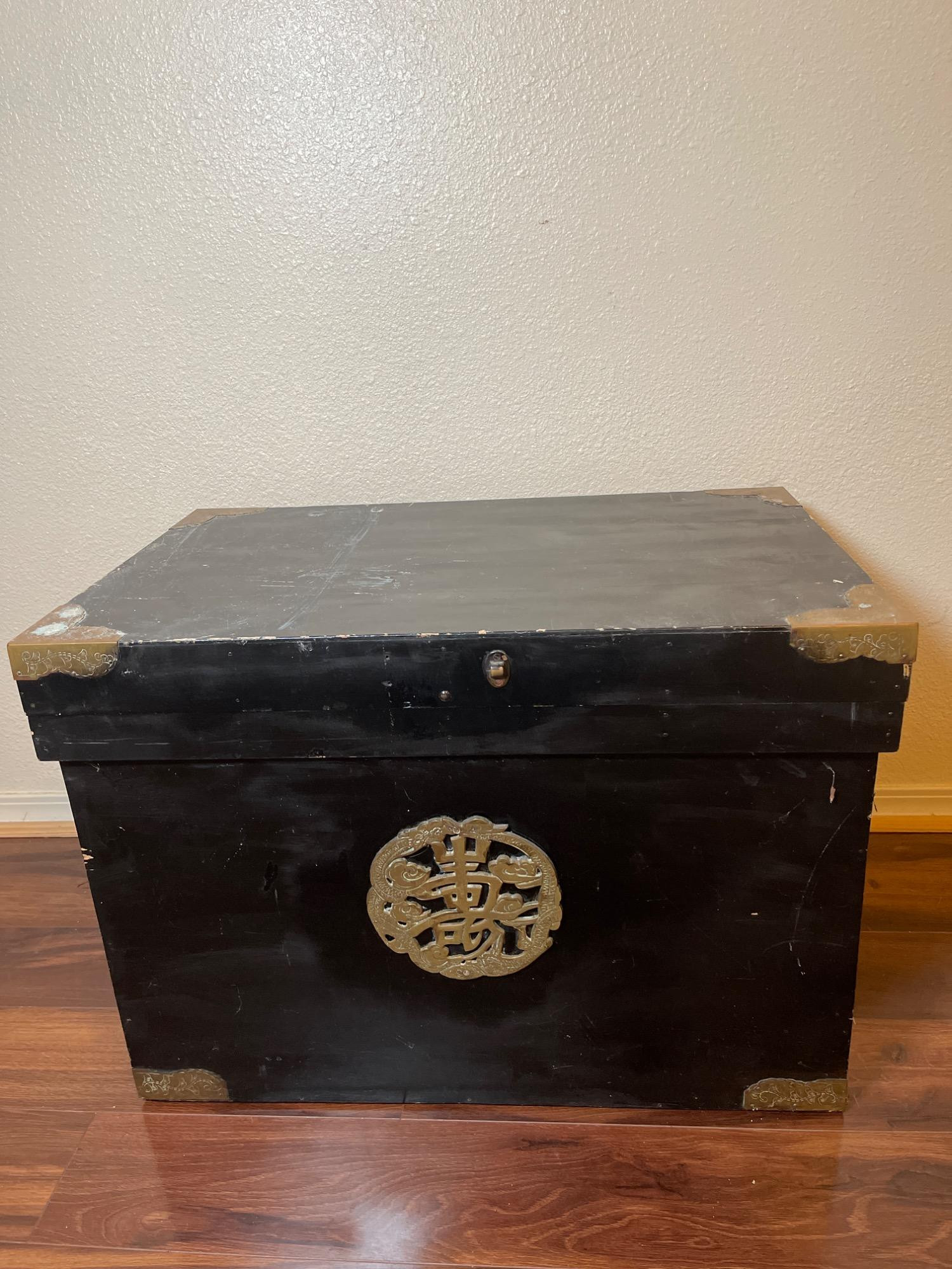 Black painted wood tea chest. Lined with galvanized metal. Original brass accents. Hinged lid with chain connection.