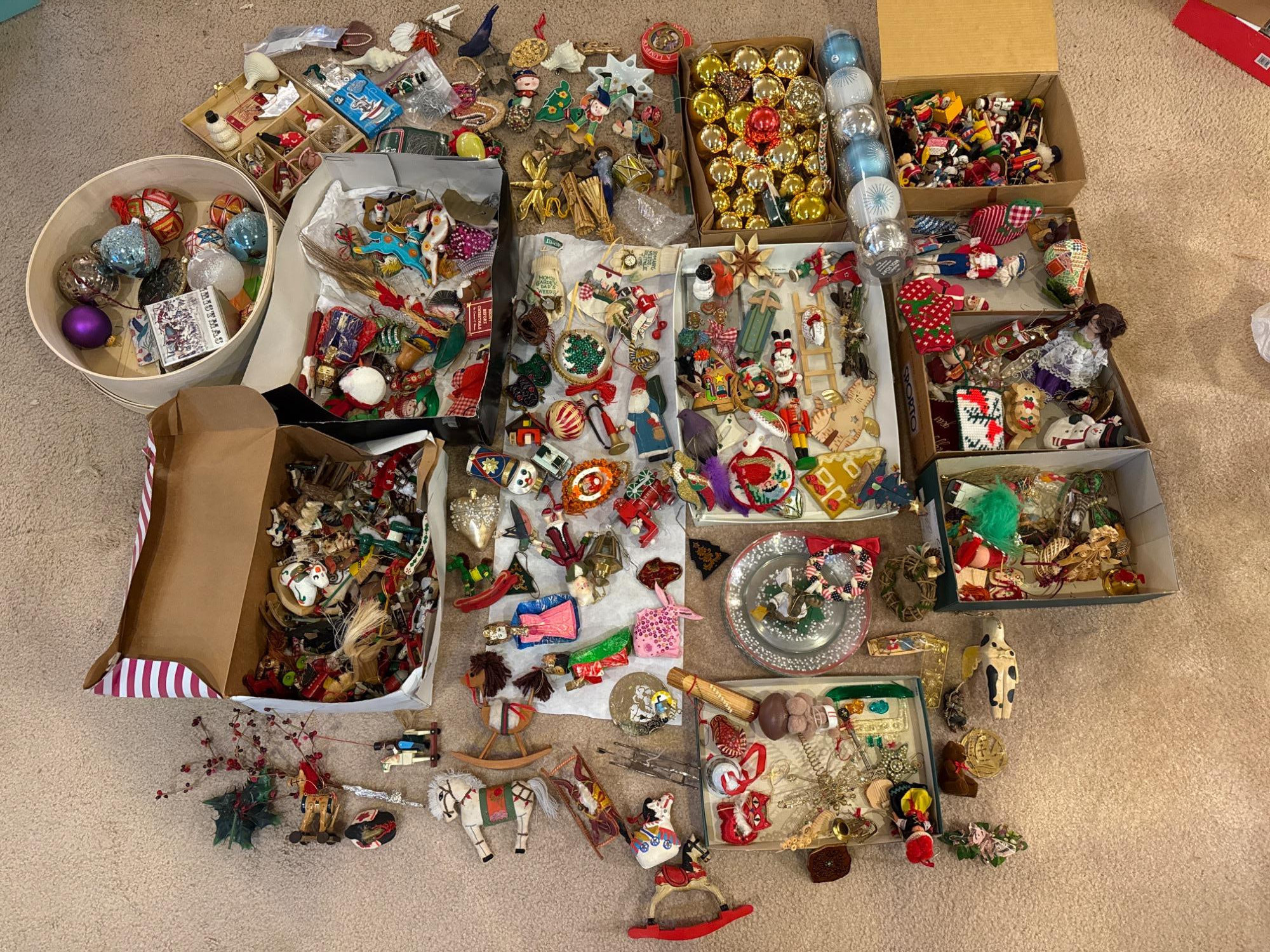 Christmas Ornament Bonanza. Every style, size, era and material represented. Wood, Fabric, glass, metal and more materials. Nordic, Asian, Americana and assorted cultures represented. So many items here to satisfy any tree. New and used. Some handmade