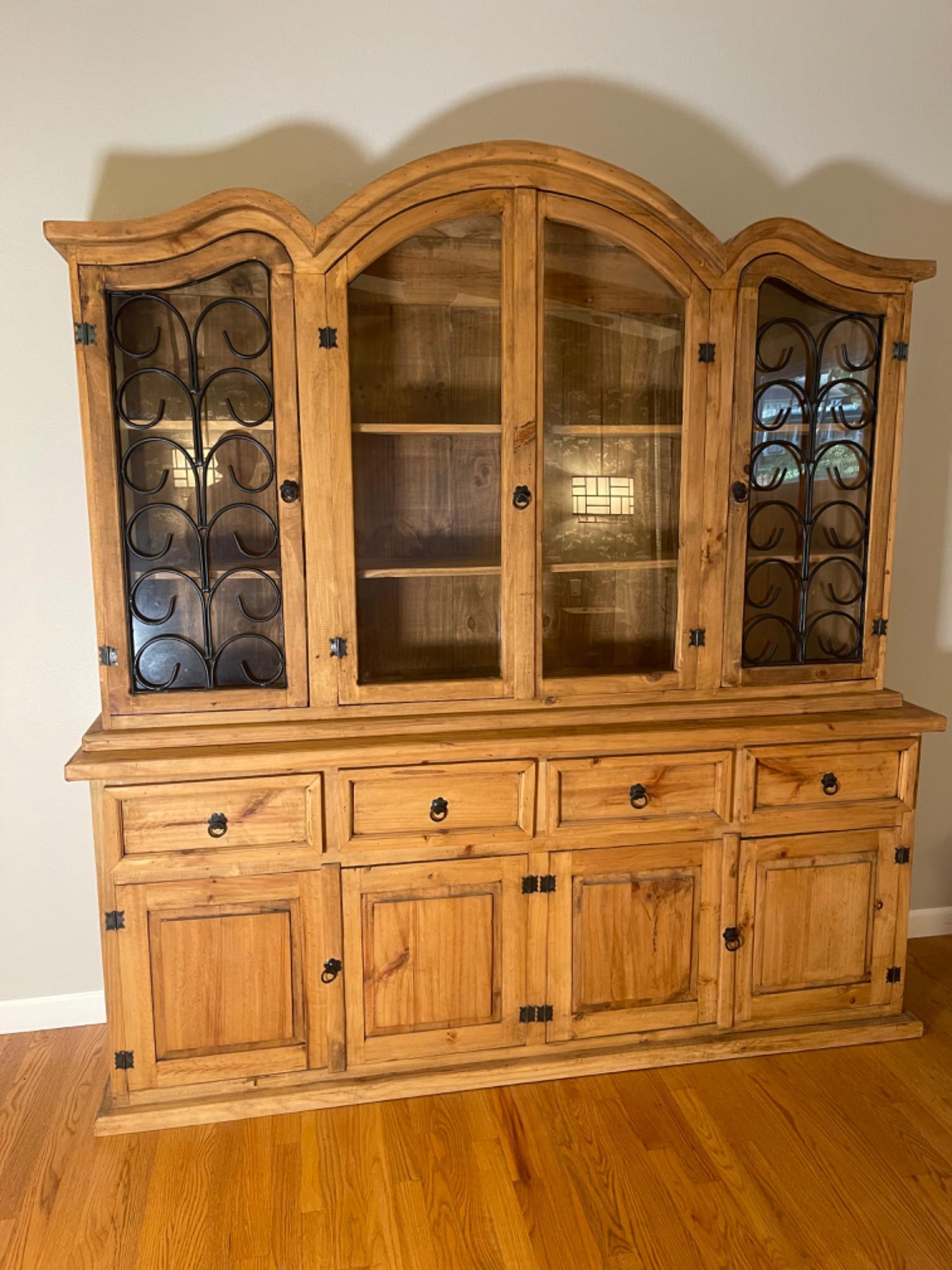 Large Rustic Wood Hutch One glass door sits slightly open, but could be fixed with a replacement piece. Wood has some scratches and scuffs from use but is in great condition.