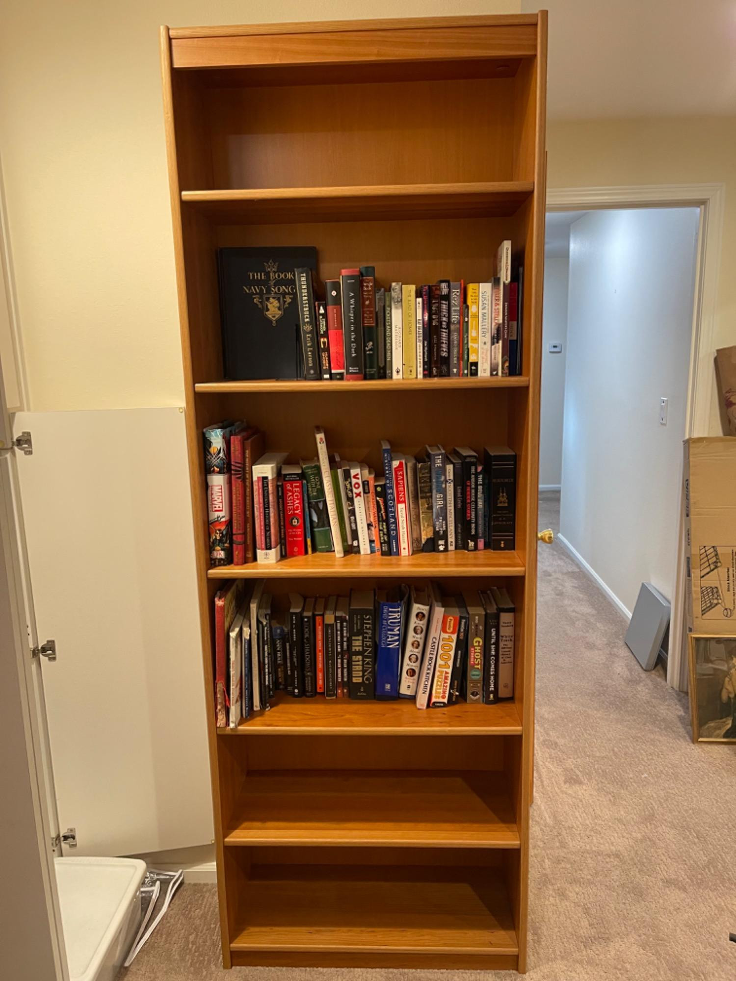 Tall Bookshelf and Books Bookshelf has some scratches and scuffs from years of use, but is in good sturdy condition. All books in photos are included in sale.