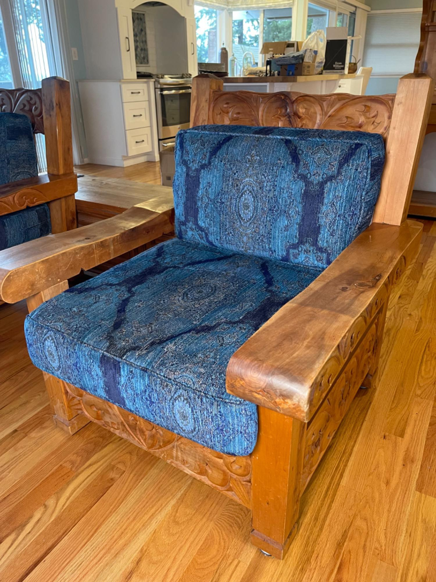 Vintage Hand Carved Solid Wood Chair From Mexico #2 This piece was brought up from Mexico and has passed through generations! There is some staining, scratches and splitting to wood from years of use. However, it is a well made piece that is holding together beautifully. Please see photos for proper representation of quality. Cushion is in good used condition.