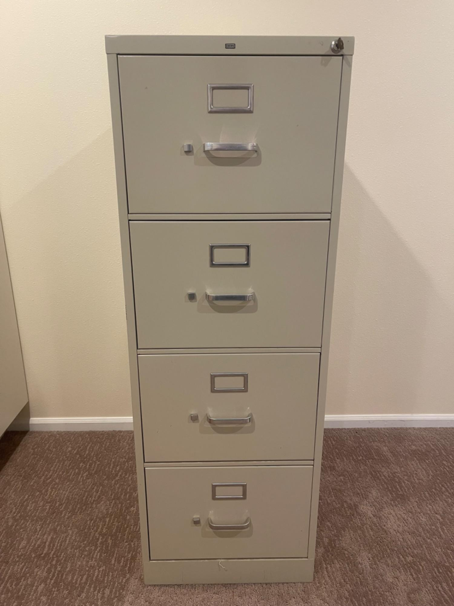 Metal Lockable File Cabinet Cabinet has some scratches, scuffs and dents, but is in good condition. Key included, lock working well.