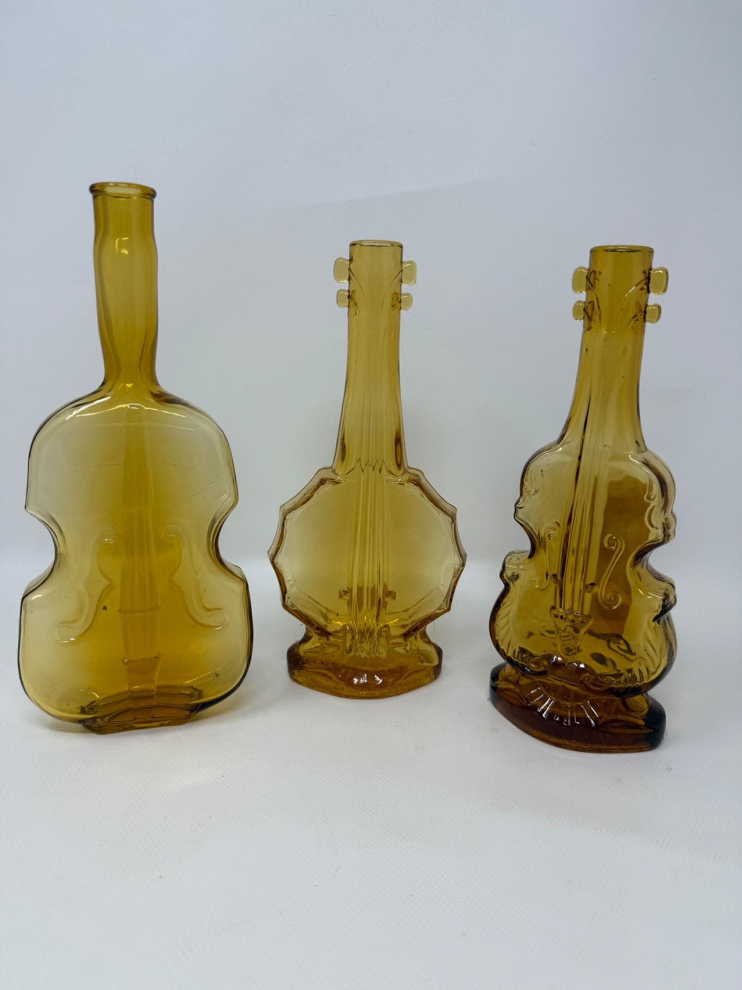 Amber Violin Bottles and Amber Banjo Bottle Makers mark on bottom. Nello Corp. Two with substantial base support.