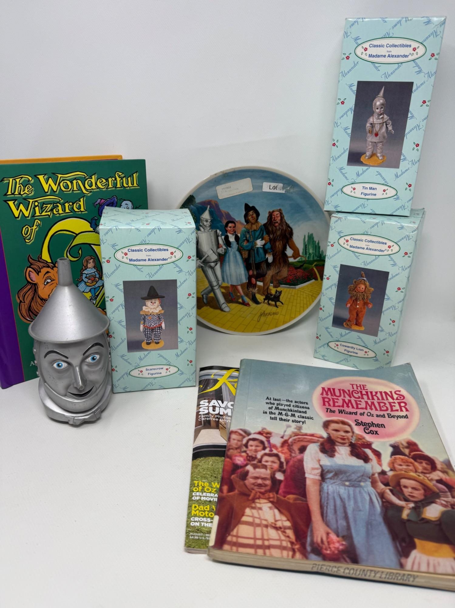 Fun collection of Wizard of Oz items. Like new pop-up book, plastic Tin man drink cup with hinged lid. Collector plate has stickers on it Three resin figurines in box Large collector book