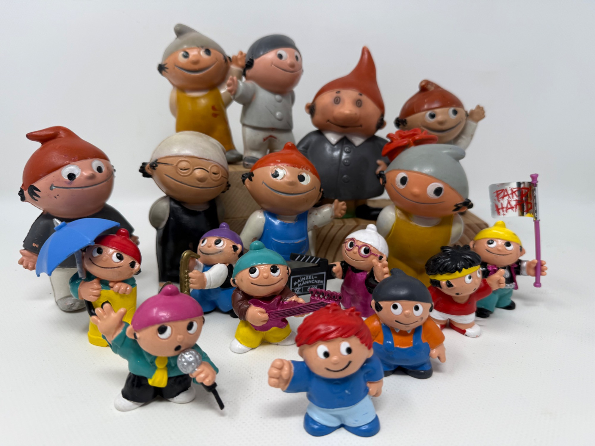 German cartoon characters Mainzelmannchen of the 1960's and early 1970's. Plastic/rubber like material. Goebel makers mark One in red cap is larger in size.