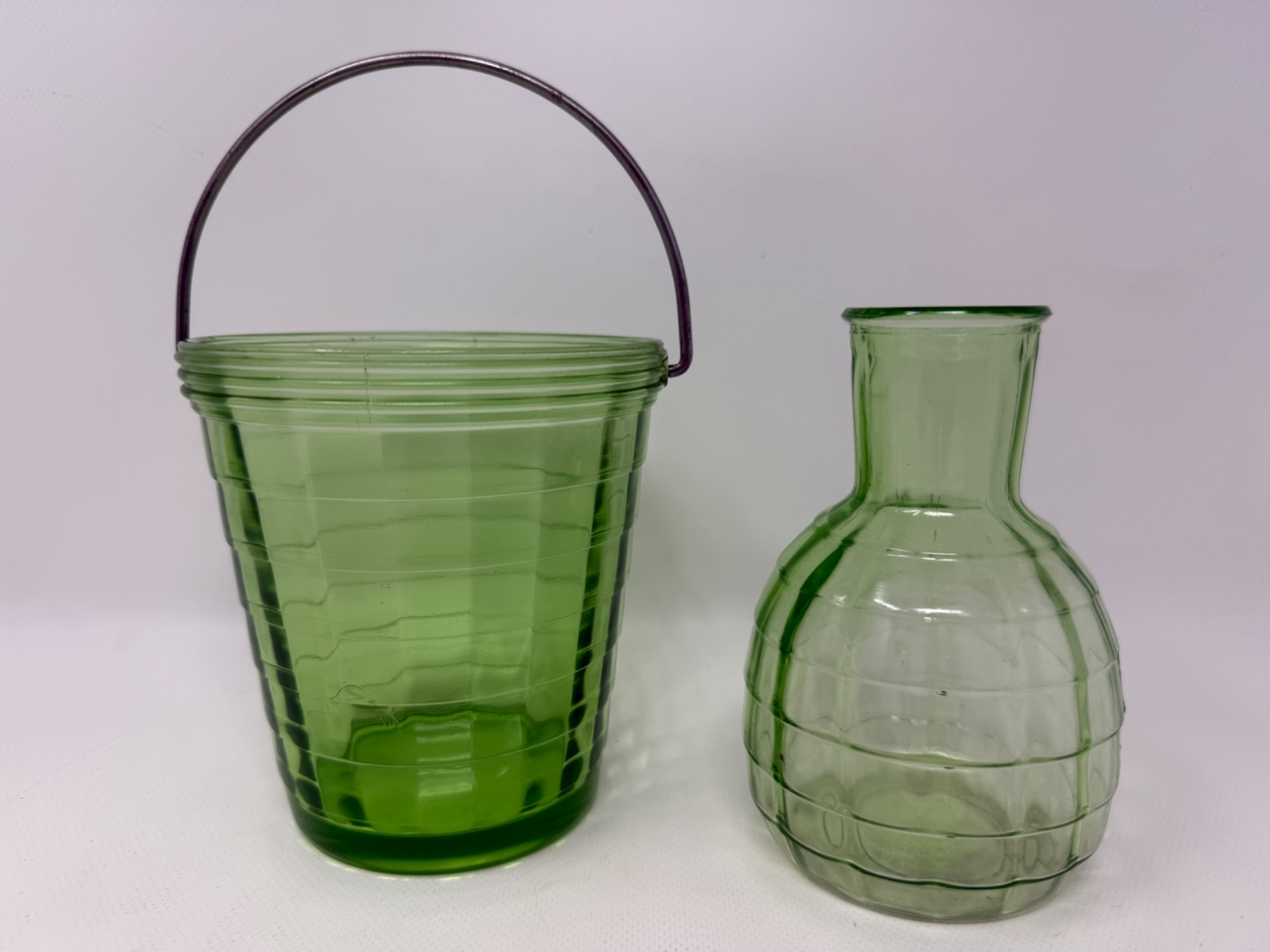 Green Block Optic pattern depression glass items Uranium glass ice bucket and carafe Ice bucket with handle is 9in tall has rimmed top Carafe is 6in tall In great condition