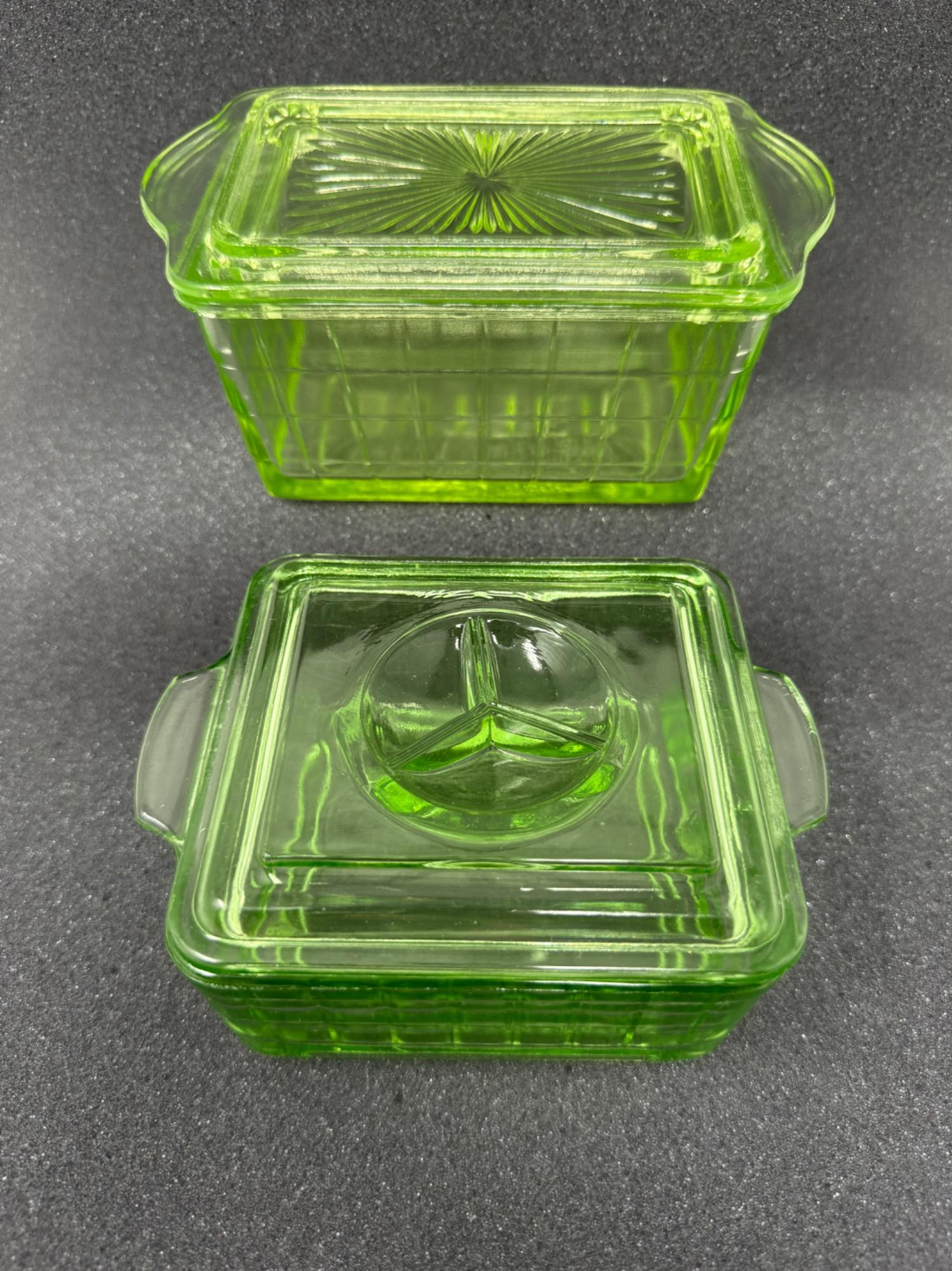 Green Block Optic Uranium Glass Butter Dish and Refrigerator Dish with Lids Largest-7L x 4 W x 4T Smaller-6L 3T x 4.5W