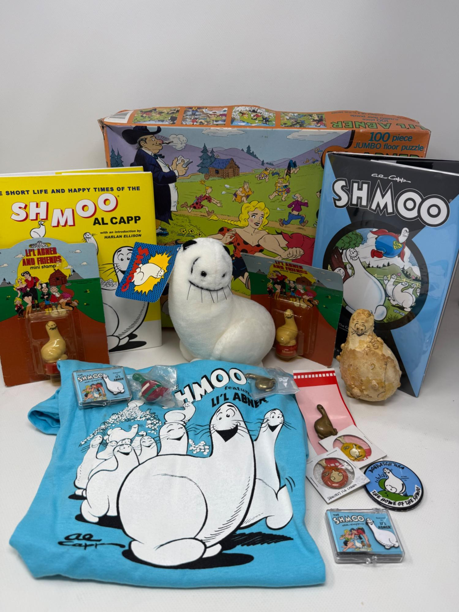 Lil Abner and Shmoo Collectibles-Plush, Books, Shirt and More. Shirt is size large Most items still in packaging unopened Lil' Abner puzzle with large pieces.