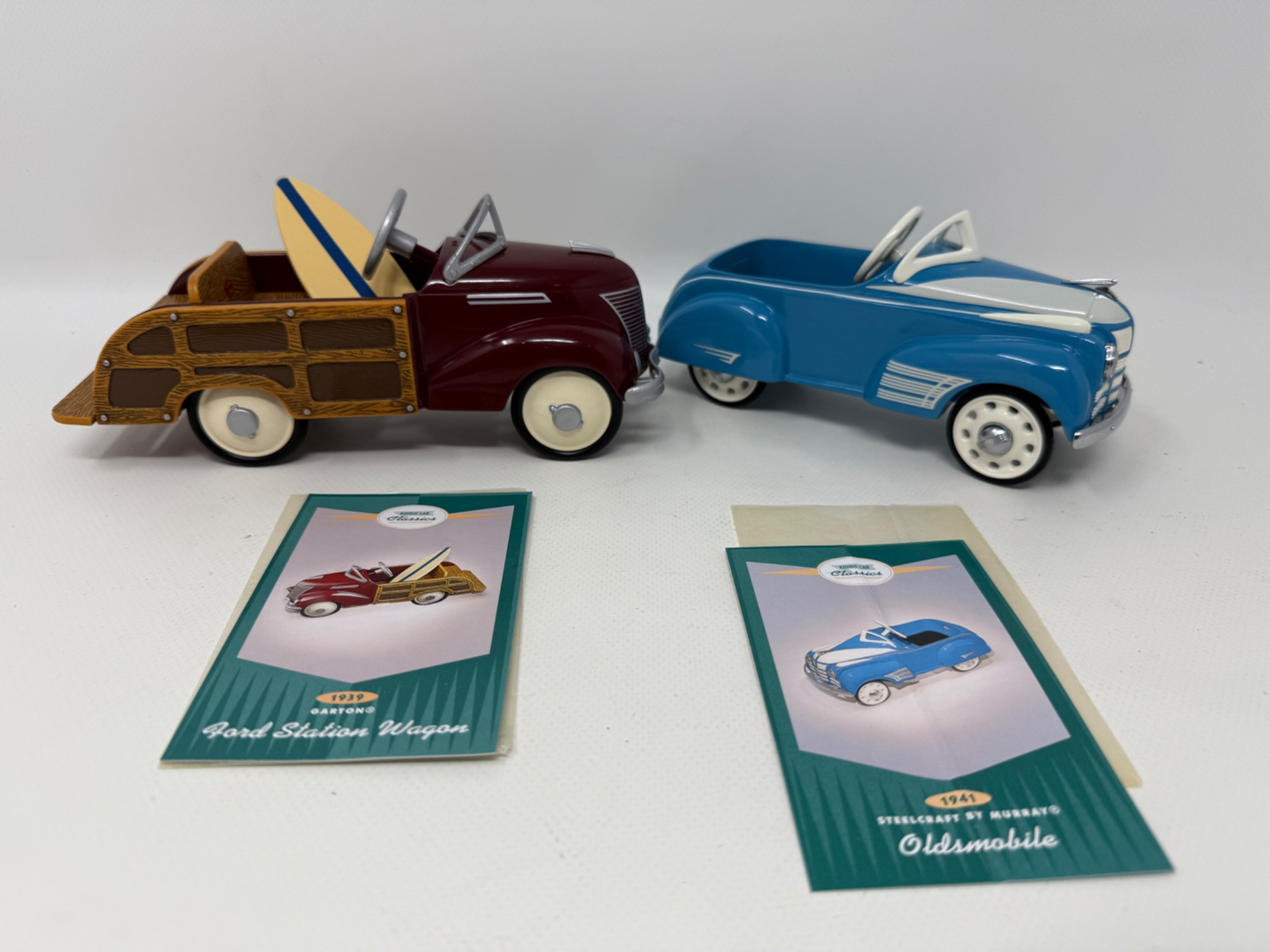 NIB-Hallmark Kiddie Classics collectible cars 1939 Ford Station wagon with plastic surfboard 1941 Oldsmobile Heavy Steelcraft construction with moving parts. Great paint and detail. Includes Trademark cards