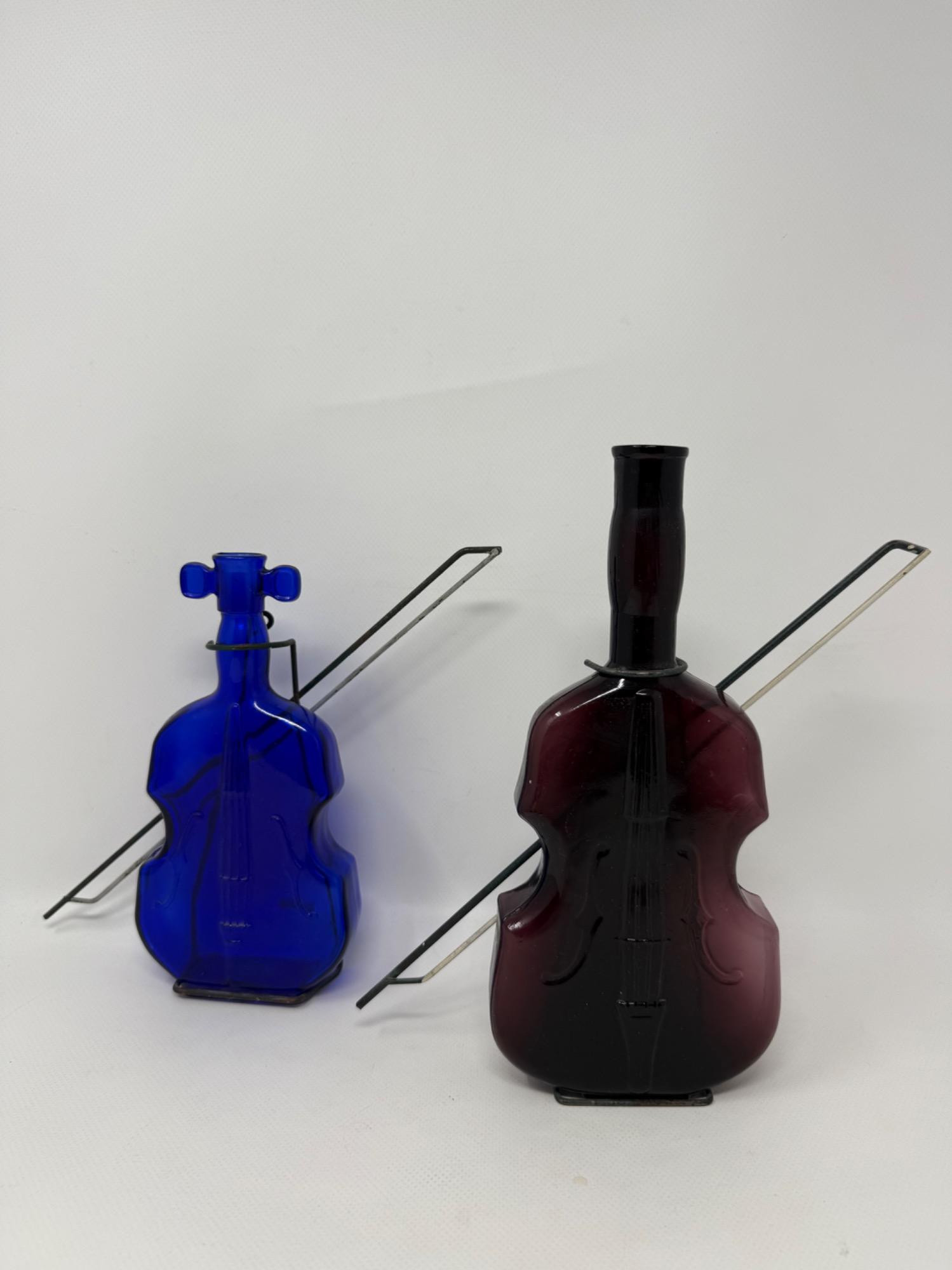 Two glass violin bottles with metal bow and mounting hooks One has peg detail. Both have great violin detail. 10 and 8 inches tall