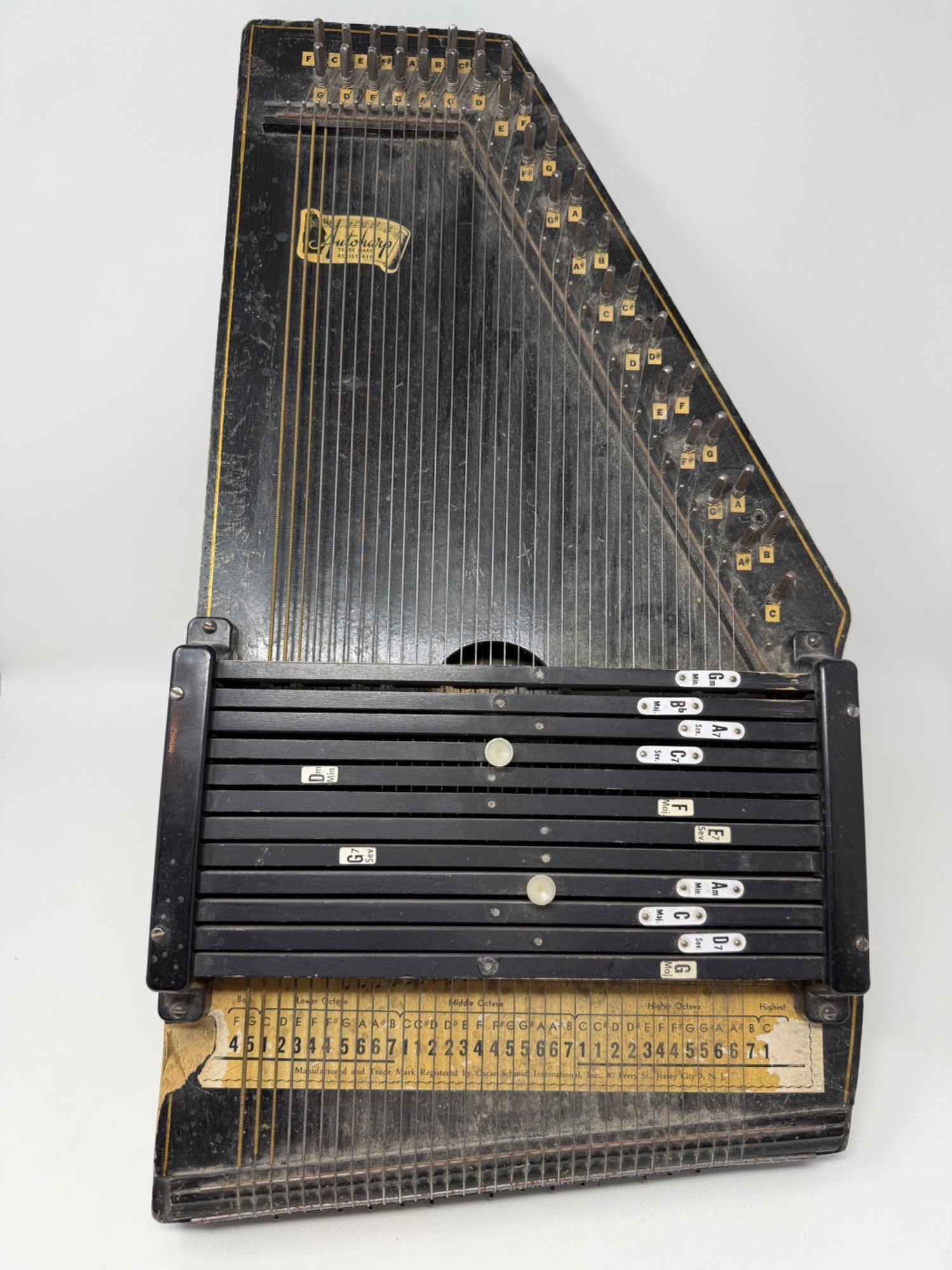 Antique Oscar Schmidt Auto Harp-36 String. This instrument, for the most part, is working. The strings are mostly intact, but there is oxidation on the keys, so I’m not sure if it would need new strings and a clean-up. Framework is intact. There is a tight crack on the back. This is an old instrument, so please base your purchase decision on the pictures provided. 11 x 22 x 3