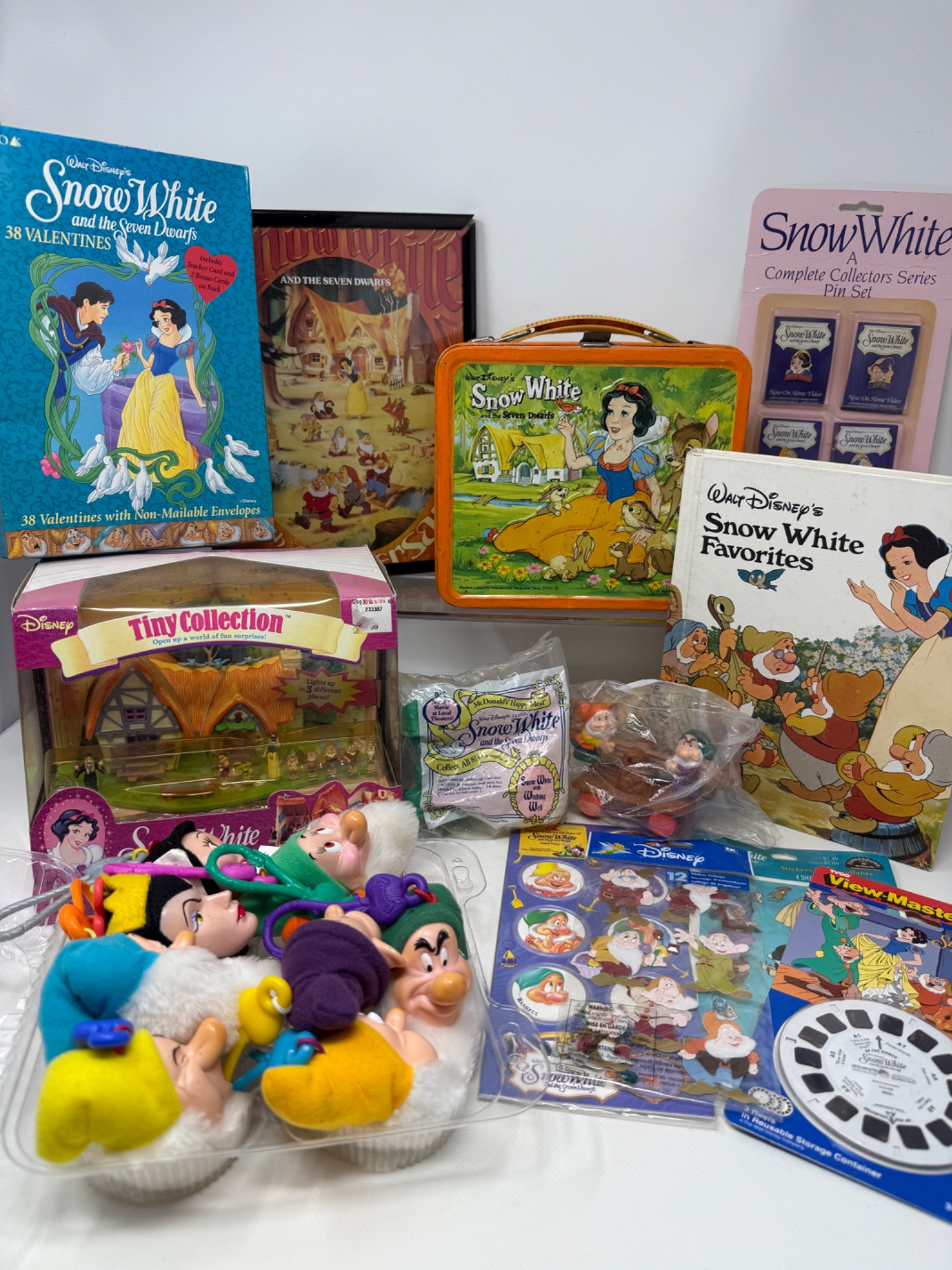 Snow White Toys, Pins, Lunchbox and Collectibles. Several items new in packaging. Collector pins, McDonalds toys, Valentines cards and light up cottage, stickers and more