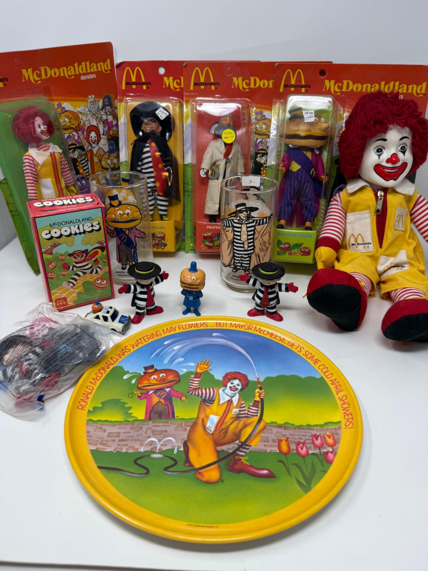 Superfans of McDonalds will find rare collectibles here. Plastic Childs plate, two beverage glasses with Hamburgler. Empty cookie box, Small plastic toys. Four Collector dolls in box-Ronald McDonald, Hamburgler, Professor and Mayor McCheese Plush McDonald doll with hard plastic head