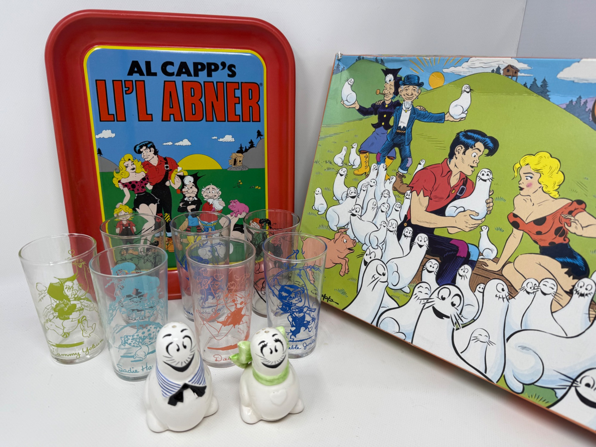 Lil Abner and Smoosh are ready for company. Metal serving tray, Seven vintage character tumblers. S/P shakers and a large puzzle