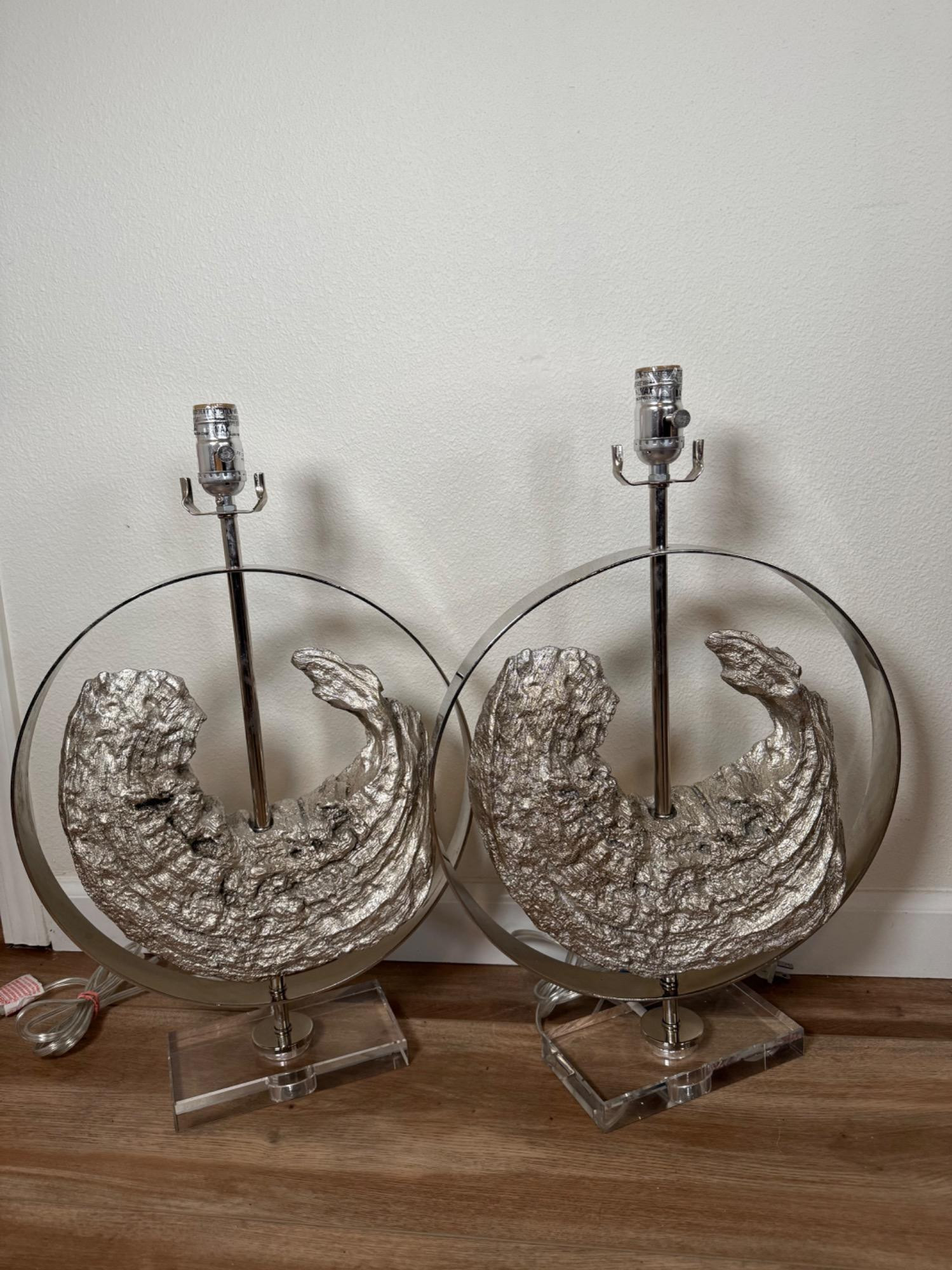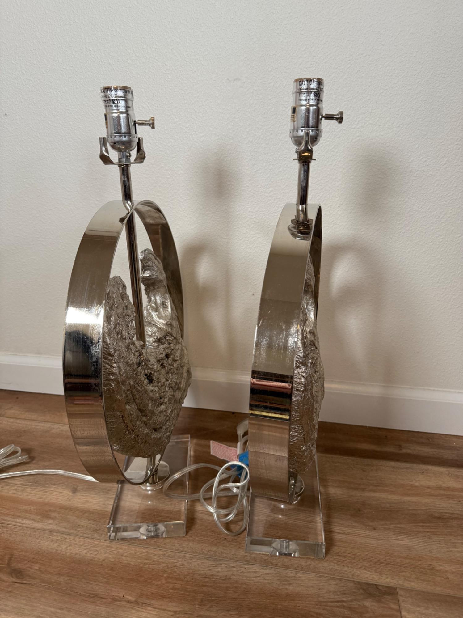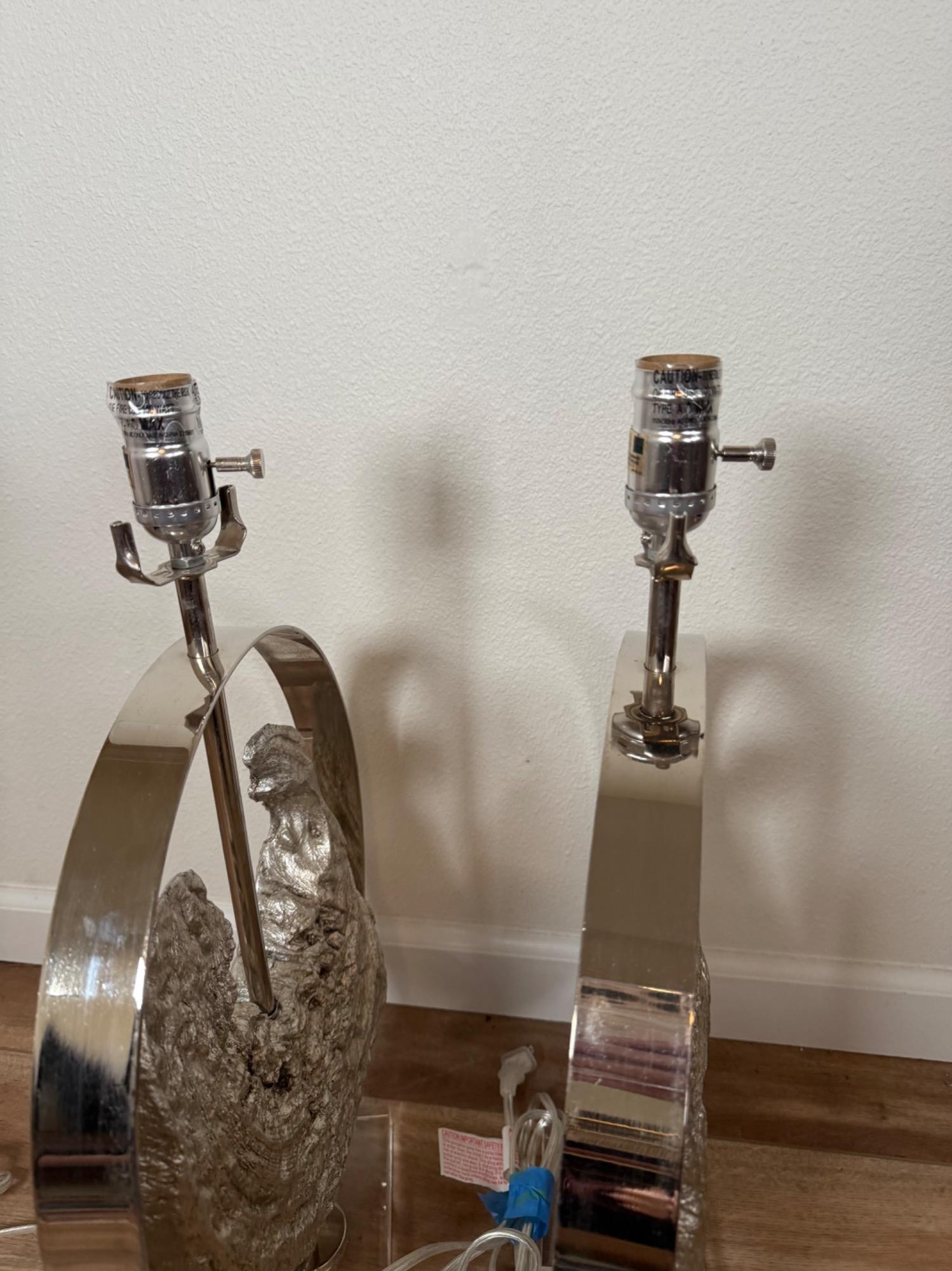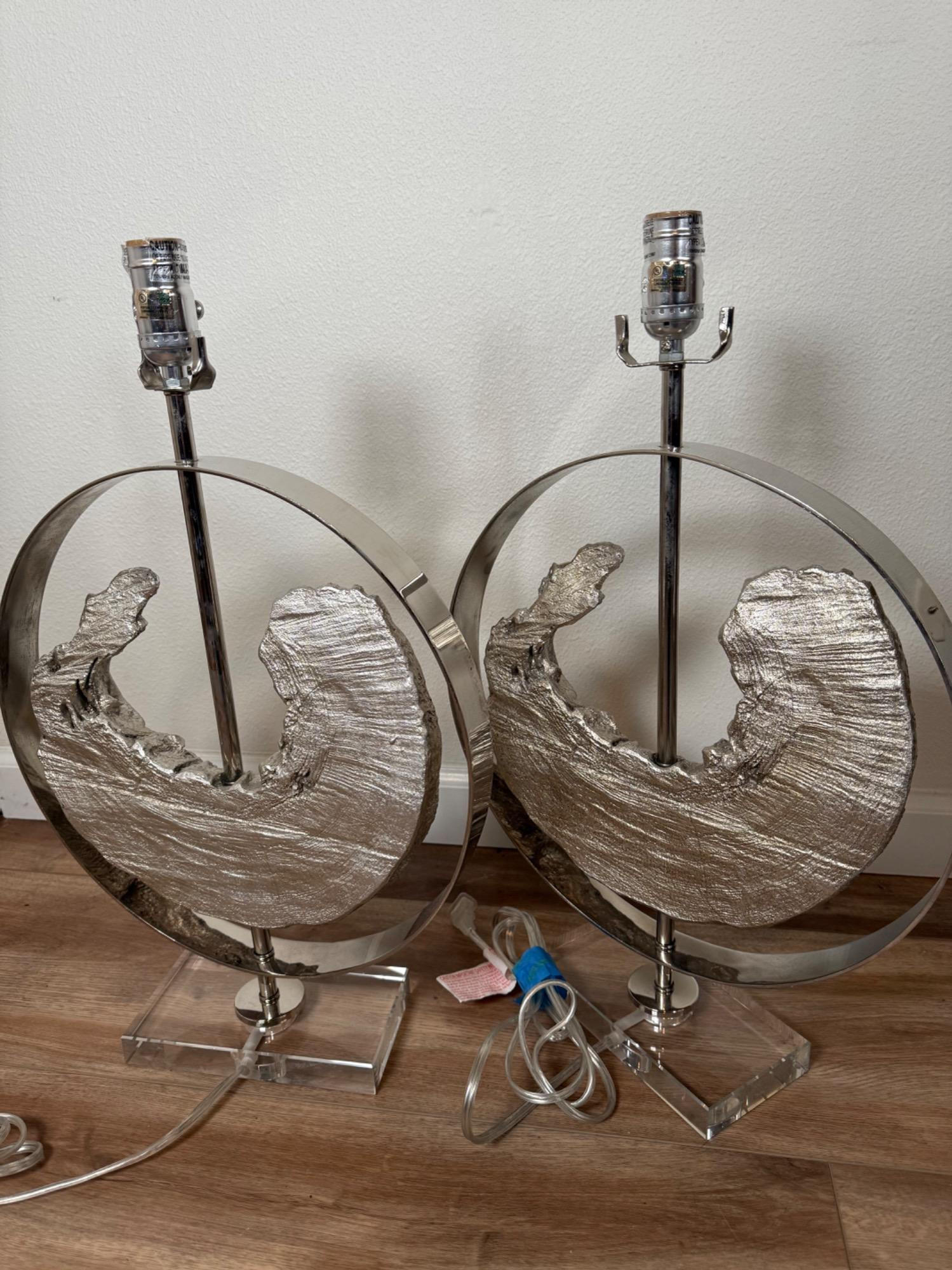 Pair of Mid Century Uttermost Ambler-Style Table Lamps This pair of Ambler-style table lamps features a modern and sculptural design with dimensions of 17 inches tall and 14.5 inches wide. Its contemporary aesthetic and clean lines make it perfect for elevating the look of your living space, bedroom, or office. These pieces combine style and functionality to enhance any décor. 29.5" Tall Very good condition.