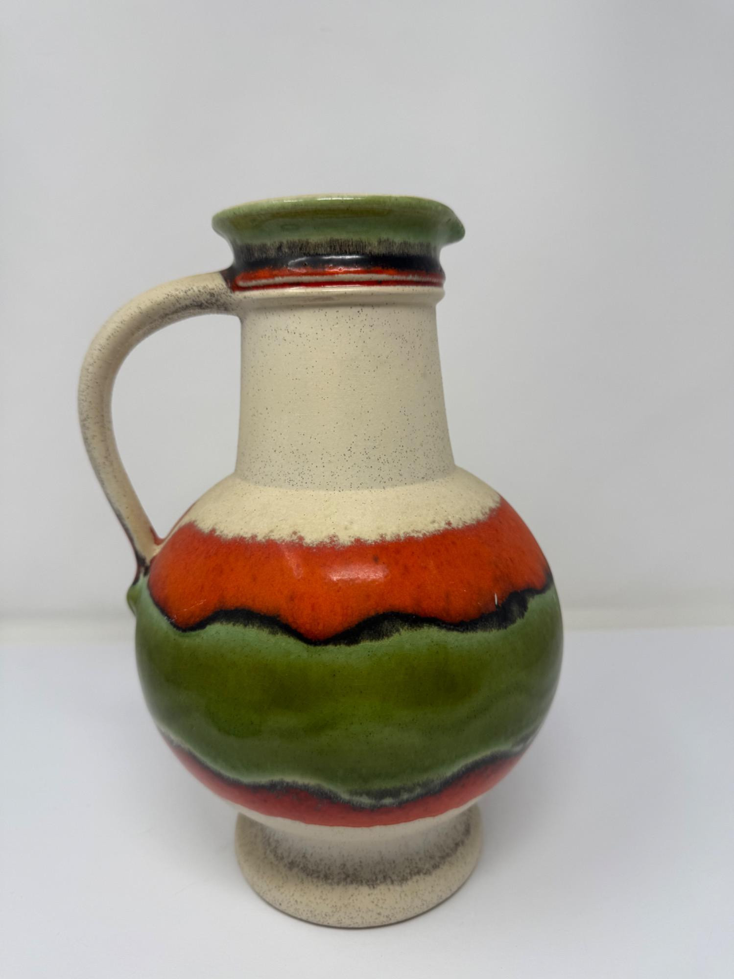 This stunning vintage pottery pitcher by Uebelacker Keramik, measuring 10.5 inches tall and 7 inches wide. Made in West Germany, it features a vibrant hand-glazed design with earthy tones of red, green, and black that beautifully contrast the natural ceramic base. Era-1970