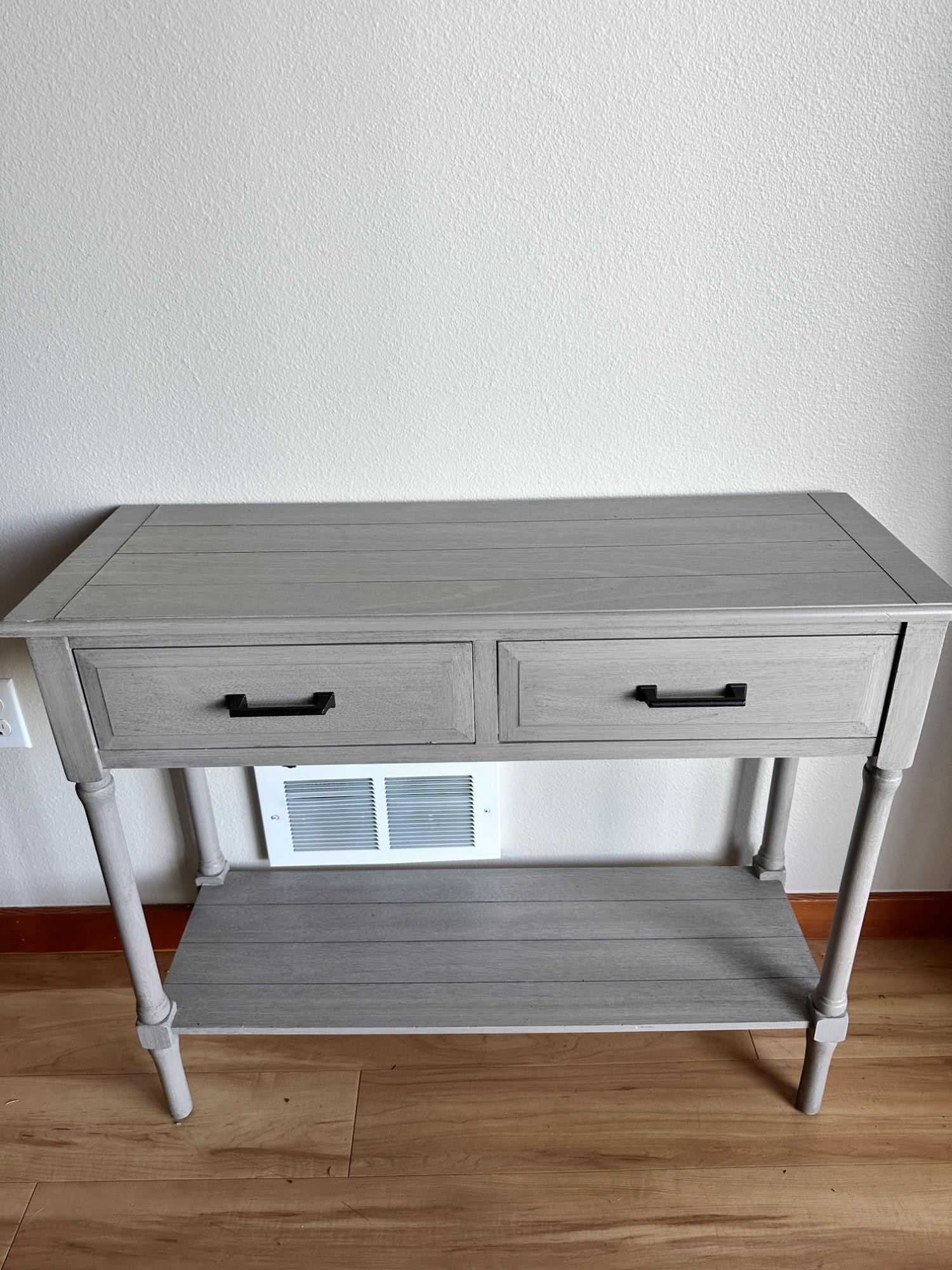 Filbert-Style 2-Drawer Console Table – White-Washed Gray. This charming Filbert-style console table features a white-washed gray finish, offering a rustic yet refined look. Measuring 30 inches tall, 36 inches wide, and 13 inches deep, it includes two spacious drawers with black metal handles and a lower open shelf for storage or display. Bidding on this lot is an agreement that: (1.) You will have 2 capable, able-bodied persons to lift and load at a minimum. (2.) You will bring a hand truck and/or any other tools needed to remove this item. If these steps are not followed your item will be forfeited and no refund given.