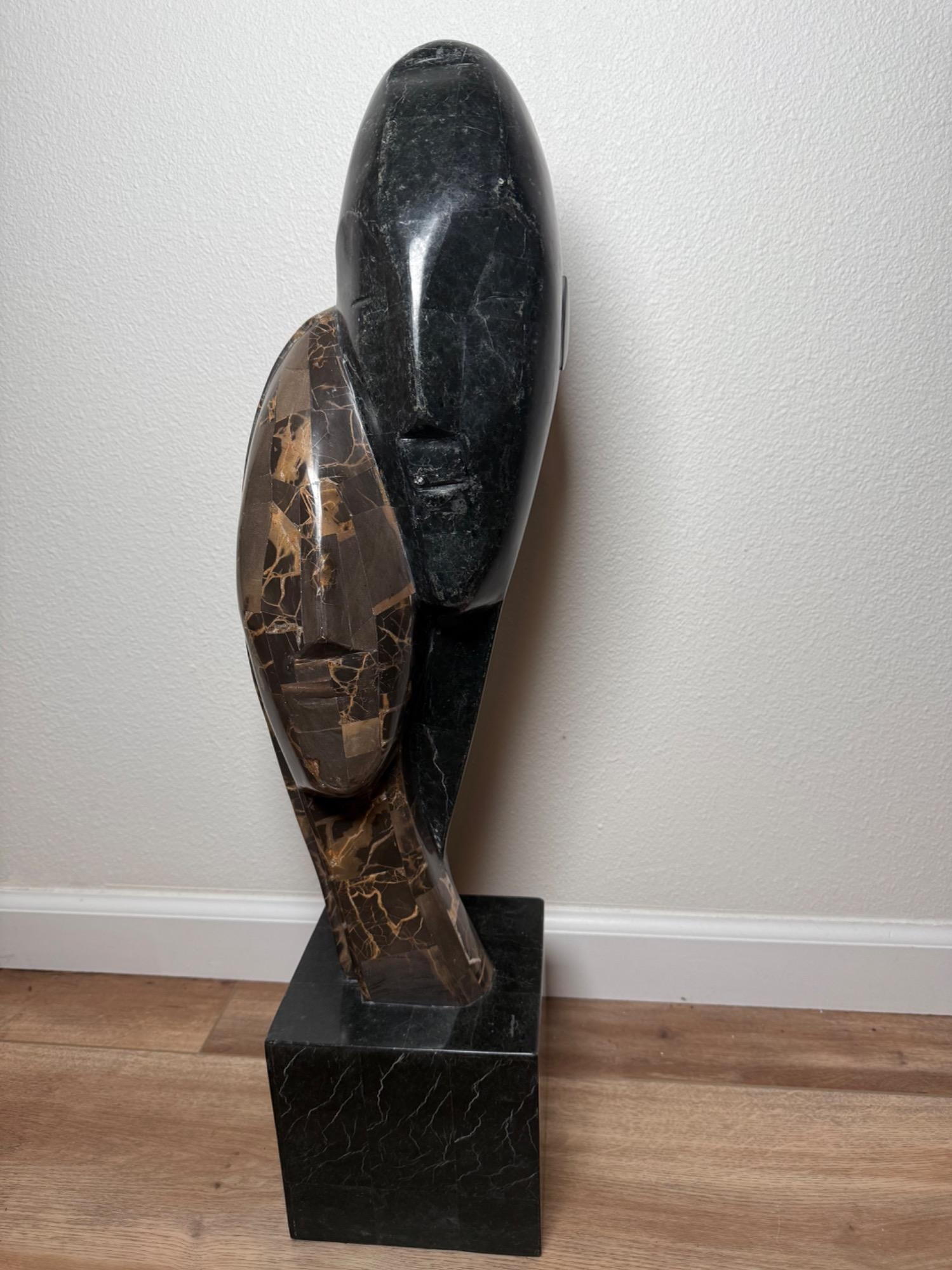 Stunning African-inspired abstract sculpture measuring 28” tall and 6” wide. Crafted from a blend of polished stone materials, this piece adds a touch of sophistication and cultural depth to any space. Perfect for art enthusiasts or collectors seeking a unique statement piece.