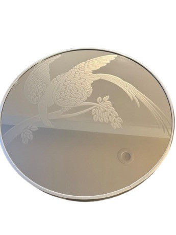 Gorgeous Mid-Century Modern etched mirror featuring a detailed "Bird of Paradise" design, crafted by Windsor Art Products. This stunning piece includes a silver-toned frame and measures 23.5” in diameter. A sophisticated and timeless addition to any decor, perfect for collectors or enthusiasts of MCM design!
